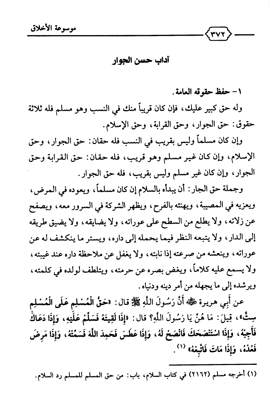 وجملة حق الجار: أن يبدأه بالسلام إن كان مسلمًا، ويعوده في المرض، ويعزيه في المصيبة، ويهنئه بالفرح، ويظهر الشركة في السرور معه، ويصفح عن زلاته، ولا يطلع من السطح على عوراته، ولا يضايقه، ولا يضيق طريقه إلى الدار، ولا يتبعه النظر فيما يحمله إلى داره، ويستر ما ينكشف له عن عوراته، وينعشه من صرعته إذا نابته، ولا يغفل عن ملاحظة داره عند غيبته، ولا يسمع عليه كلامًا، ويغض بصره عن حرمته، ويتلطف لولده في كلمته، ويرشده إلى ما يجهله من أمر دينه ودنياه.
