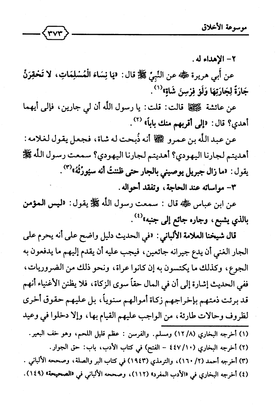 عن عبد الله بن عمرو - رضي الله عنه - أنه ذُبحت له شاة، فجعل يقول لغلامه: أهديتم لجارنا اليهودي؟ أهديتم لجارنا اليهودي؟ سمعت رسول الله - صلى الله عليه وسلم - يقول: "ما زال جبريل يوصيني بالجار حتى ظننتُ أنه سيُورِّثه" (¬3).