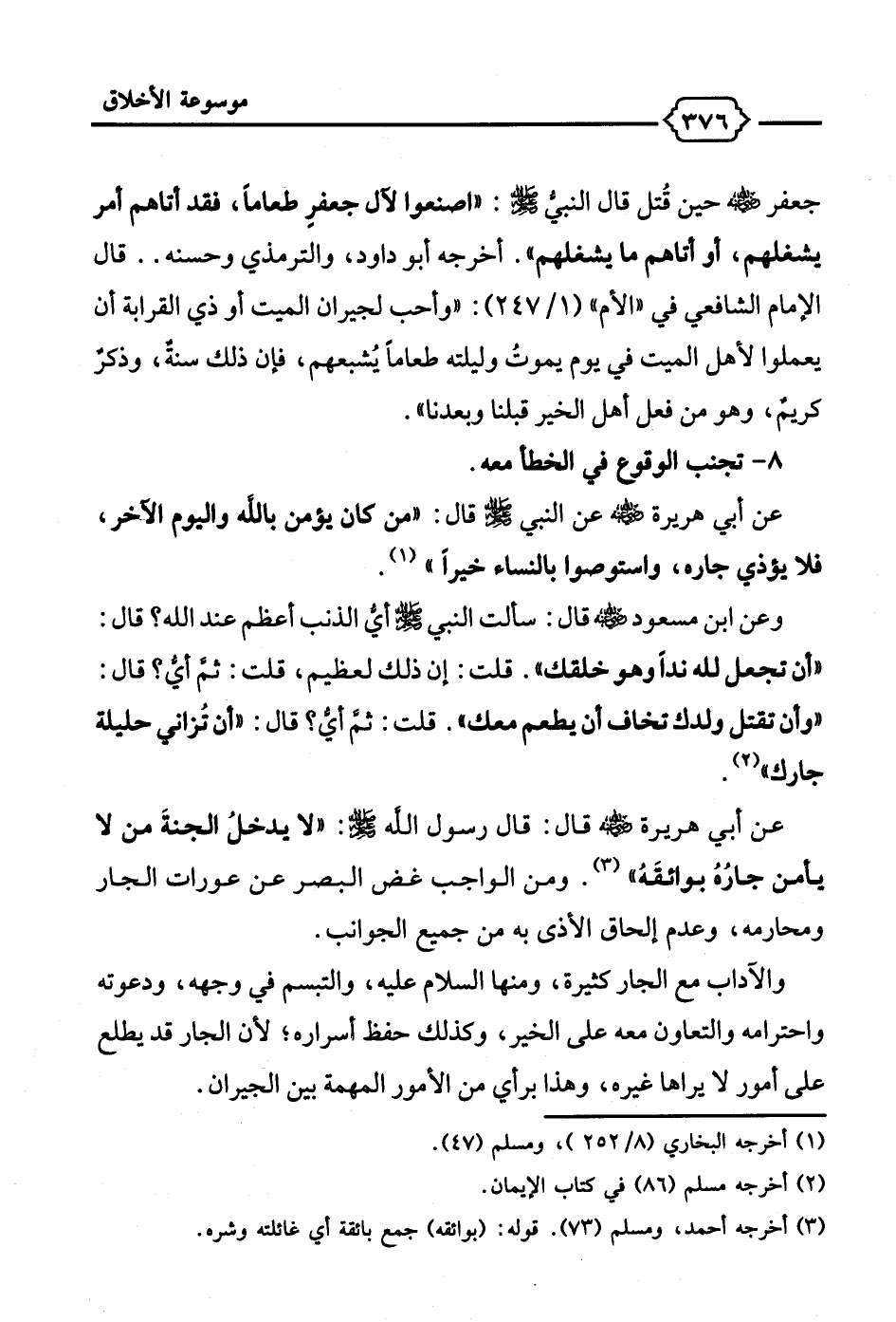عن أبي هريرة - رضي الله عنه - قال: قال رسول الله - صلى الله عليه وسلم -: "لا يدخلُ الجنةَ من لا يأمن جارُهُ بوائقَهُ" (¬3). ومن الواجب غض البصر عن عورات الجار ومحارمه، وعدم إلحاق الأذى به من جميع الجوانب.