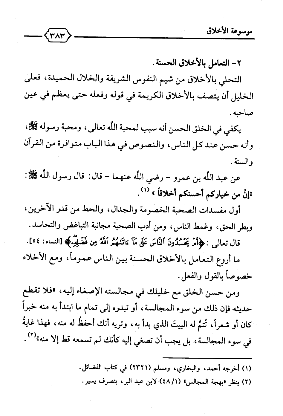 عن عبد الله بن عمرو -رضي الله عنهما- قال: قال رسول الله - صلى الله عليه وسلم -: "إنَّ من خياركم أحسنكم أخلاقاً" (¬1).