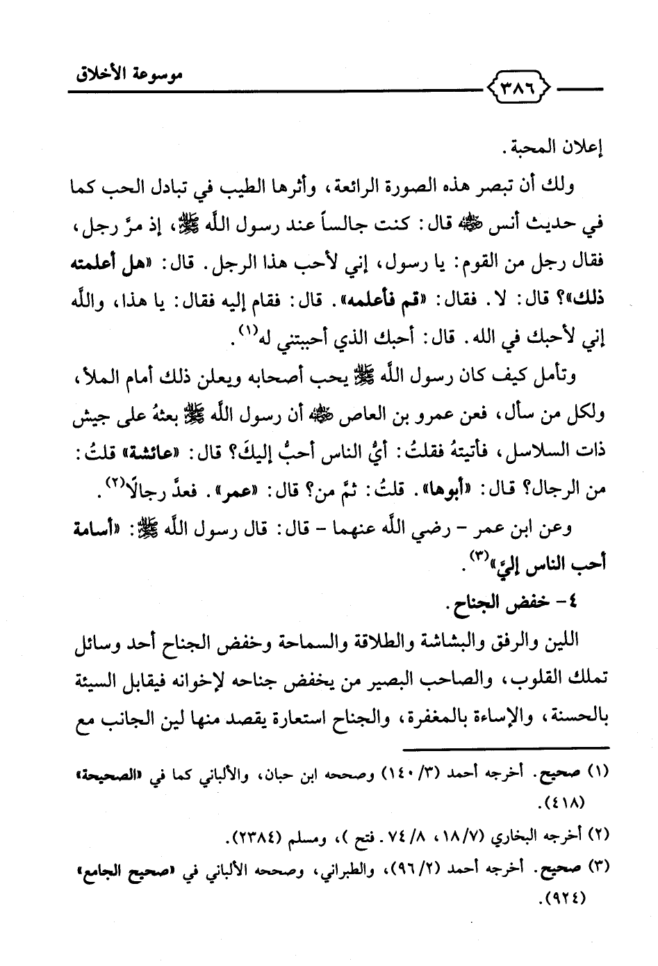 وتأمل كيف كان رسول الله - صلى الله عليه وسلم - يحب أصحابه ويعلن ذلك أمام الملأ، ولكل من سأل، فعن عمرو بن العاص - رضي الله عنه - أن رسول الله - صلى الله عليه وسلم - بعثهُ على جيش ذات السلاسل، فأتيتهُ فقلتُ: أيُّ الناس أحبُّ إليكَ؟ قال: "عائشة" قلتُ: من الرجال؟ قال: "أبوها". قلتُ: ثمَّ من؟ قال: "عمر". فعدَّ رجالًا (¬2).