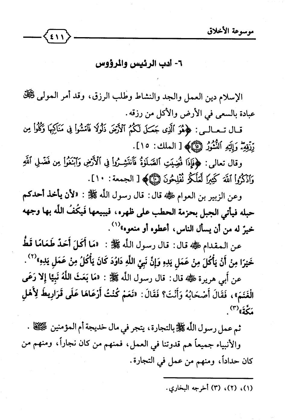 عن المقدام - رضي الله عنه - قال: قال رسول الله - صلى الله عليه وسلم -: "ما أكَلَ أَحَد طَعَاما قط خَيرًا من أن يَأكلَ من عَمَلِ يَدهِ وَإِن نَبِيَّ اللهِ داوُدَ كَانَ يَأكلُ من عَمَلِ يَده" (¬2).