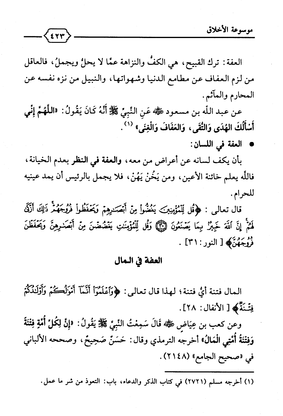 عن عبد الله بن مسعود -رضي الله عنه - عَنِ النَّبِيِّ - صلى الله عليه وسلم - أَنهُ كَانَ يَقُولُ: "اللهُم إِنِّي أَسألُكَ الهُدَى وَالتُّقَى، وَالعَفَافَ وَالغنَى" (¬1).