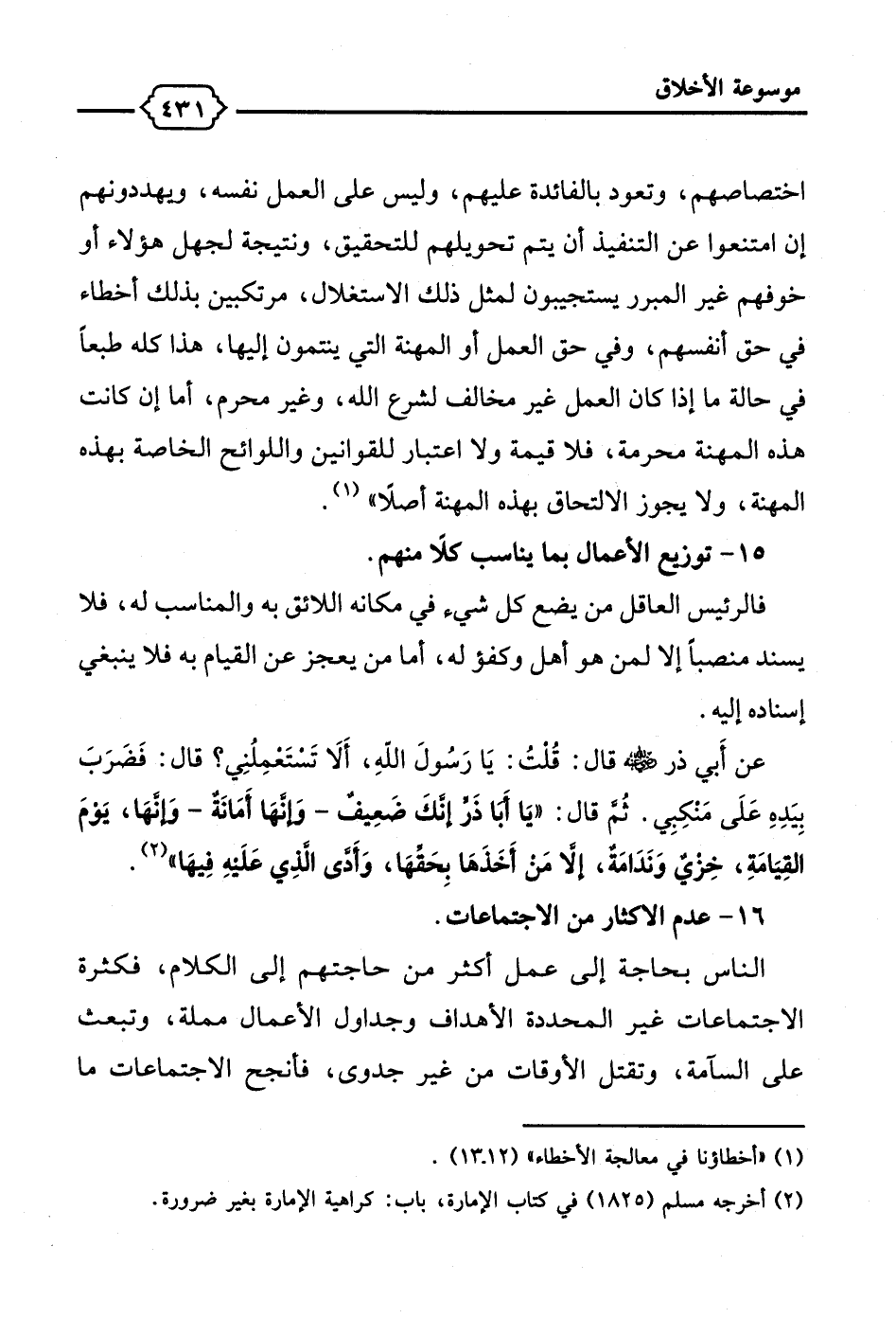 عن أَبي ذر - رضي الله عنه - قال: قُلتُ: يَا رَسُولَ الله، أَلَا تَستعمِلُنِي؟ قال: فَضَرَبَ بِيَدِهِ عَلَى مَنكِبِي. ثم قال: "يَا أَبا ذرٍّ إنَّكَ ضَعِيف -وَإنهَا أَمَانَة- وَإنهَا، يَومَ القِيَامَةِ، خِزيٌّ وَنَدامَةٌ، إلا مَن أَخَذها بِحَقهَا، وَأَدَّى الذي عَلَيهِ فِيهَا" (¬2).