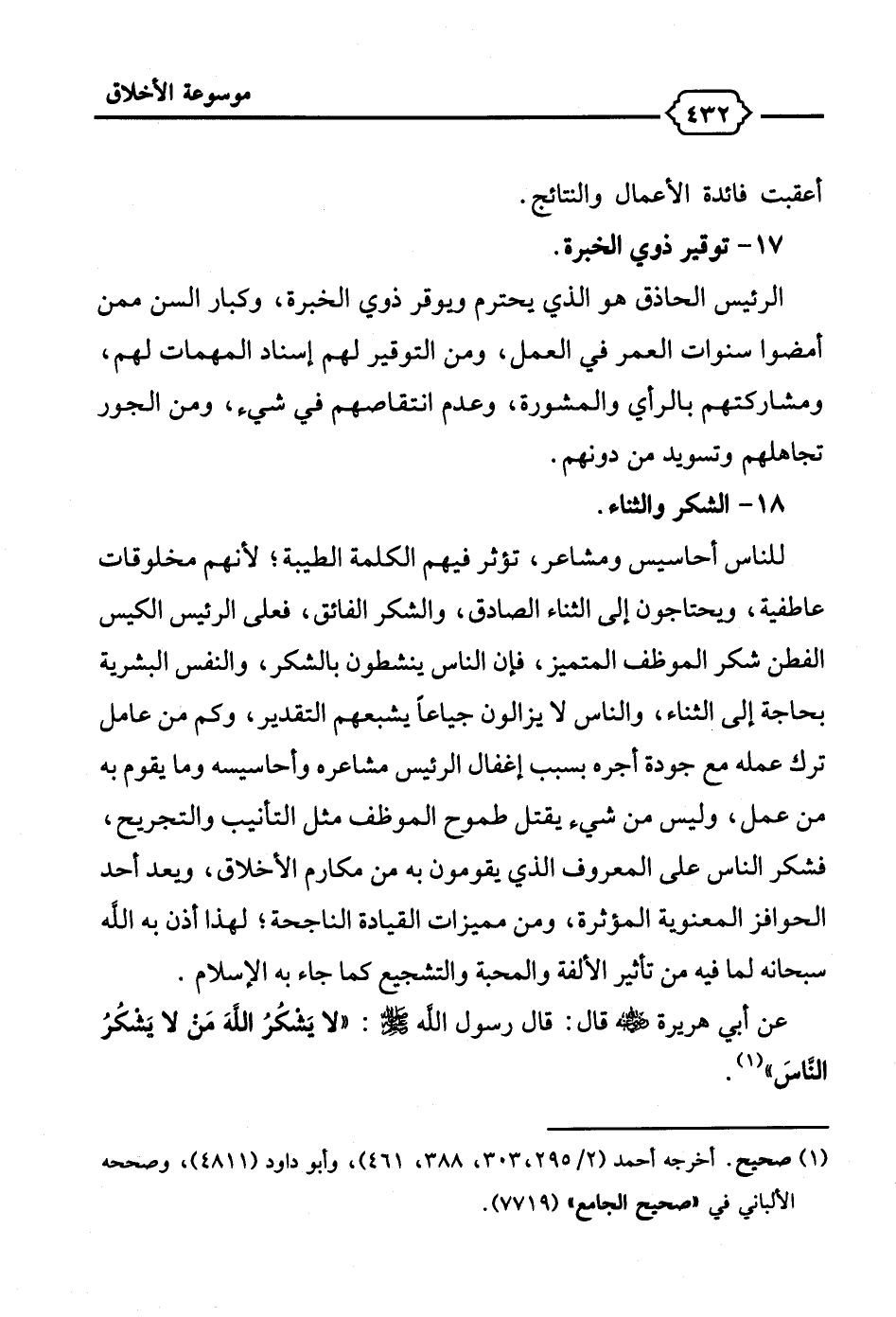عن أبي هريرة - رضي الله عنه - قال: قال رسول الله - صلى الله عليه وسلم -: "لا يَشكُرُ اللهَ مَن لا يَشكُرُ النَّاسَ" (¬1).