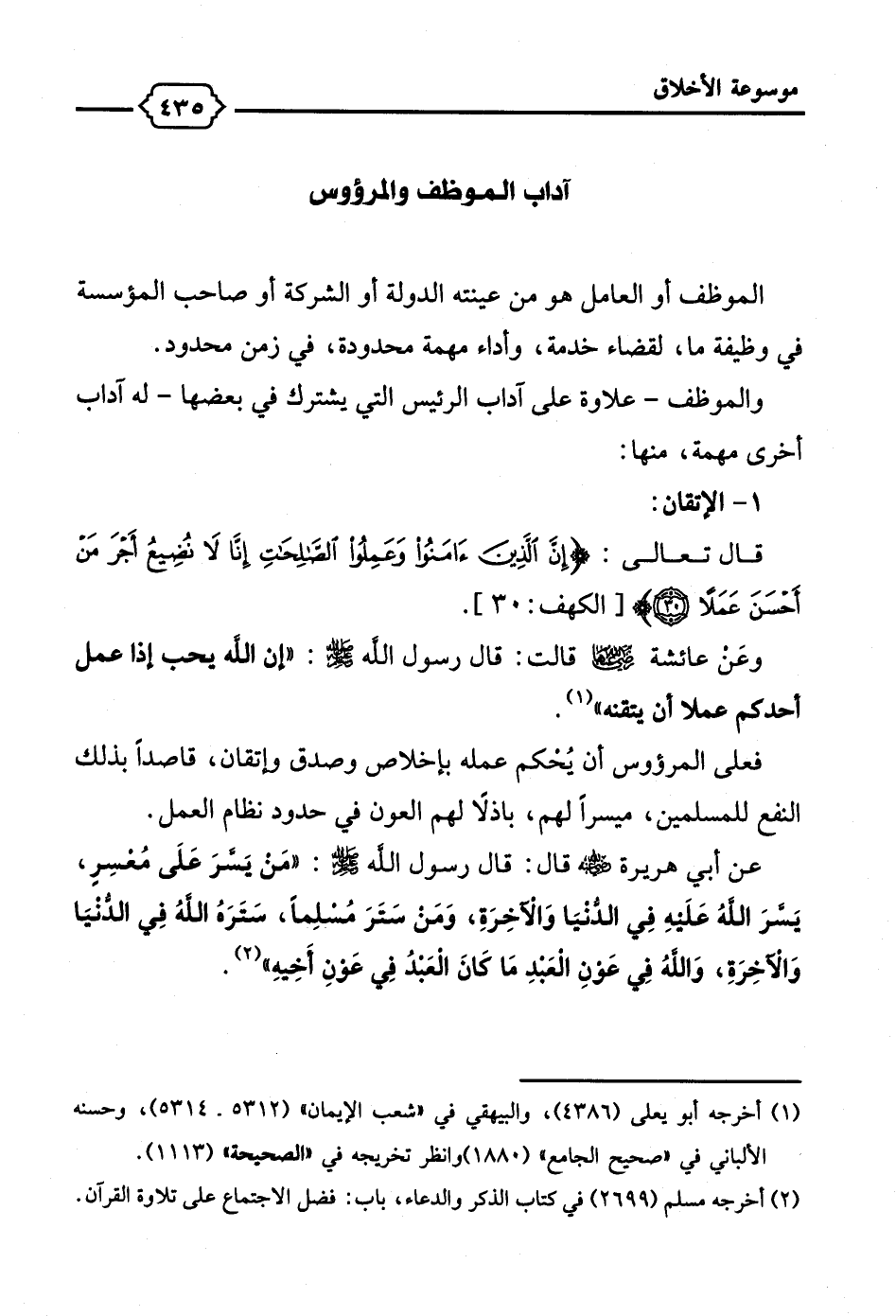فعلى المرؤوس أن يُحْكم عمله بإخلاص وصدق وإتقان، قاصدًا بذلك النفع للمسلمين، ميسرًا لهم، باذلًا لهم العون في حدود نظام العمل.