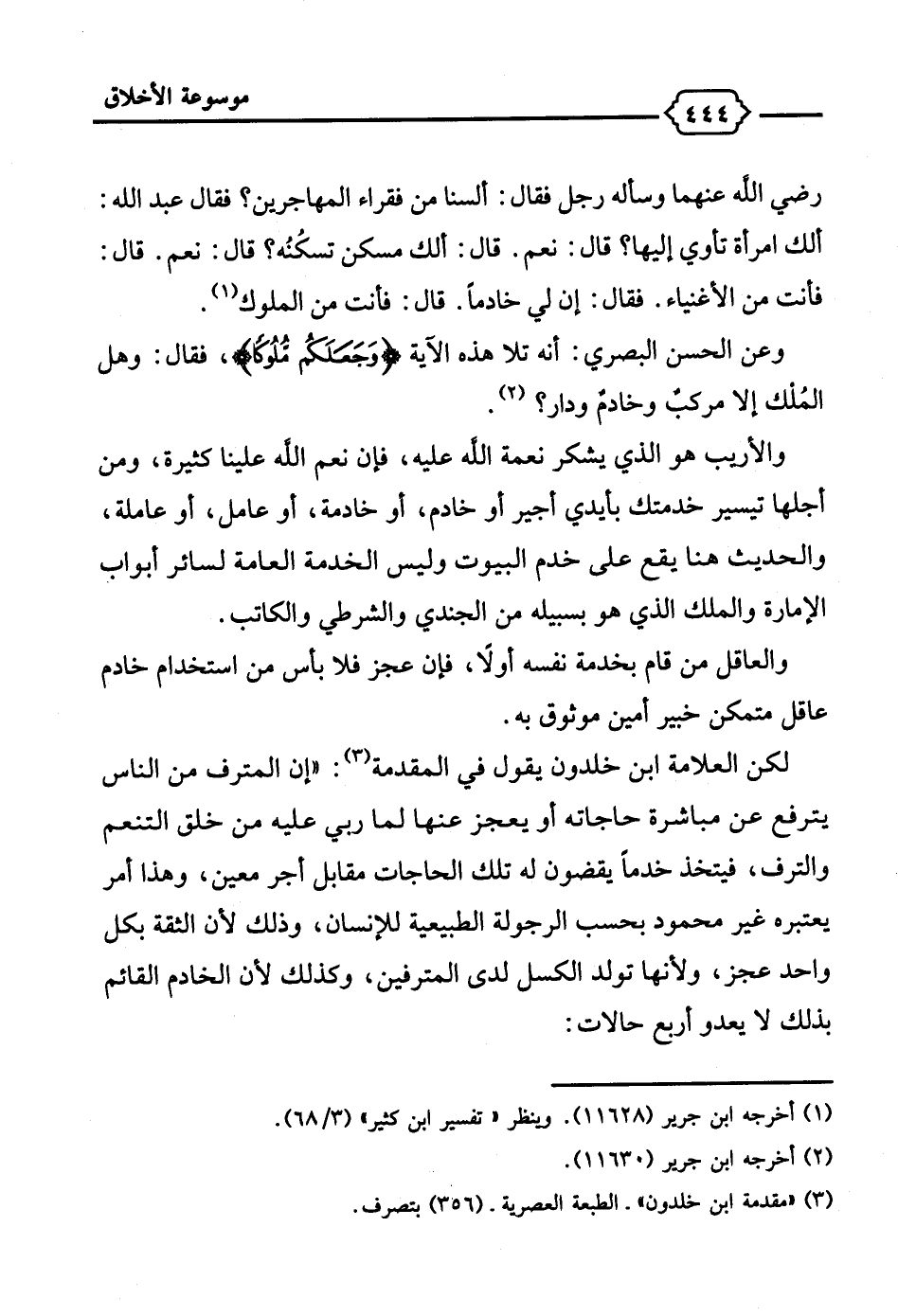 لكن العلامة ابن خلدون يقول في المقدمة (¬3): "إن المترف من الناس يترفع عن مباشرة حاجاته أو يعجز عنها لما ربي عليه من خلق التنعم والترف، فيتخذ خدمًا يقضون له تلك الحاجات مقابل أجر معين، وهذا أمر يعتبره غير محمود بحسب الرجولة الطبيعية للإنسان، وذلك لأن الثقة بكل واحد عجز، ولأنها تولد الكسل لدى المترفين، وكذلك لأن الخادم القائم بذلك لا يعدو أربع حالات: