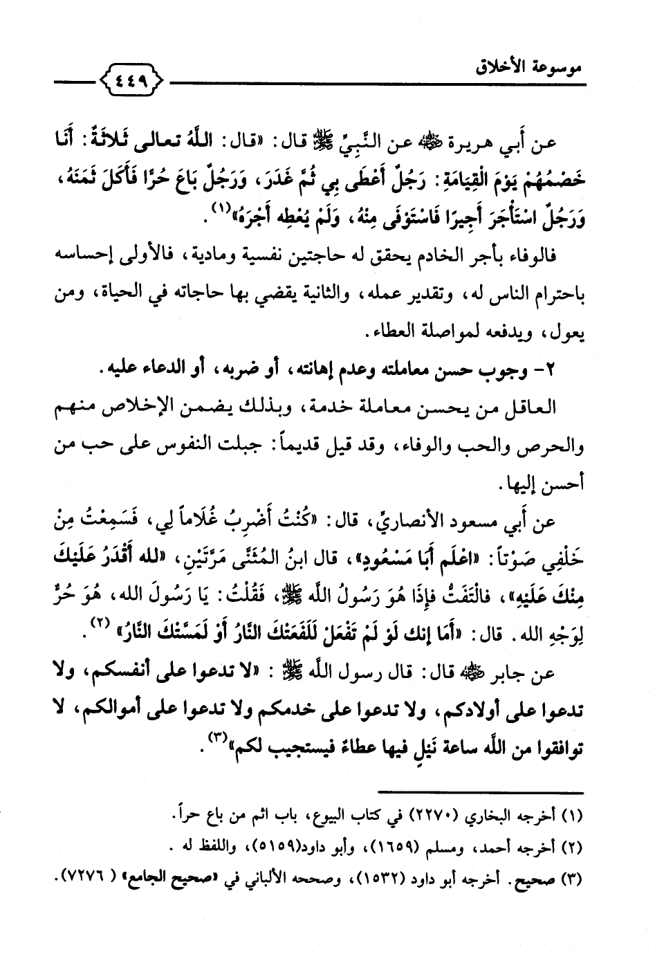 عن أَبي هريرة -رضي الله عنه - عن النبِيِّ - صلى الله عليه وسلم - قال: "قال اللهُ تعالى ثَلاَثةٌ: أَنا خَصْمُهُم يَومَ القِيَامَةِ: رجلٌ أَعطَى بِي ثمَّ غَدرَ، وَرَجل بَاعَ حُرًّا فَأكَلَ ثَمَنَهُ، وَرَجل استأجَرَ أَجِيرًا فاستوفَى مِنهُ، وَلَم يُعطِه أَجرَهُ" (¬1).