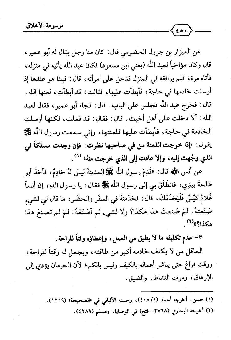 عن العيزار بن جرول الحضرمي قال: كان منا رجل يقال له أبو عمير، قال وكان مؤاخيًا لعبد الله (يعني ابن مسعود) فكان عبد الله يأتيه في منزله، فأتاه مرة، فلم يوافقه في المنزل فدخل على امرأته، قال: فبينا هو عندها إذ أرسلت خادمها في حاجة، فأبطأت عليها، فقالت: قد أبطأت، لعنها الله. قال: فخرج عبد الله فجلس علي الباب. قال: فجاء أبو عمير، فقال لعبد الله: ألا دخلت على أهل أخيك. قال: فقال: قد فعلت، لكنها أرسلت الخادمة في حاجة، فأبطأت عليها فلعنتها، وإني سمعت رسول الله - صلى الله عليه وسلم - يقول: "إذا خرجت اللعنة من في صاحبها نظرت: فإن وجدت مسلكًا في الذي وجُهت إليه، وإلا عادت إلى الذي خرجت منه" (¬1).