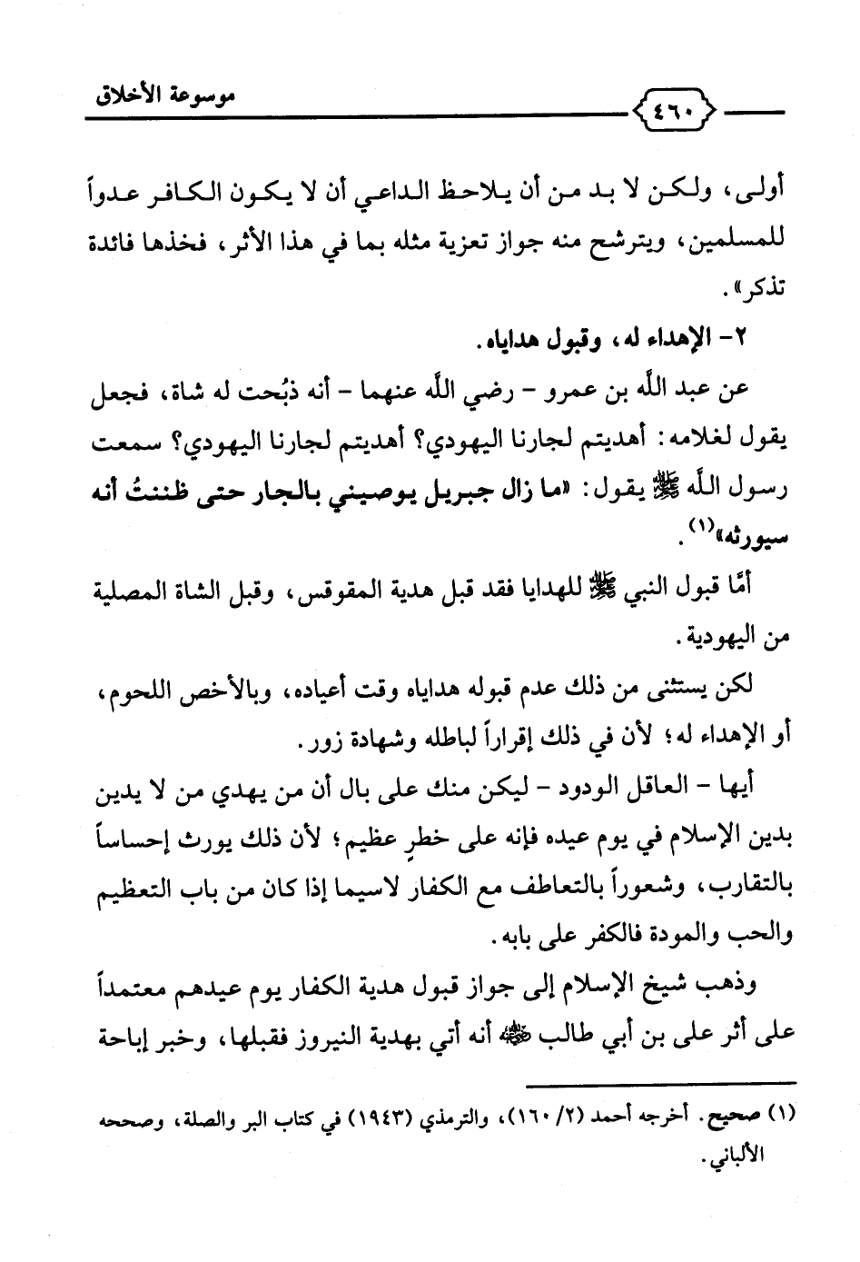 وذهب شيخ الإسلام إلى جواز قبول هدية الكفار يوم عيدهم معتمدًا على أثر علي بن أبي طالب - رضي الله عنه - أنه أتي بهدية النيروز فقبلها، وخبر إباحة