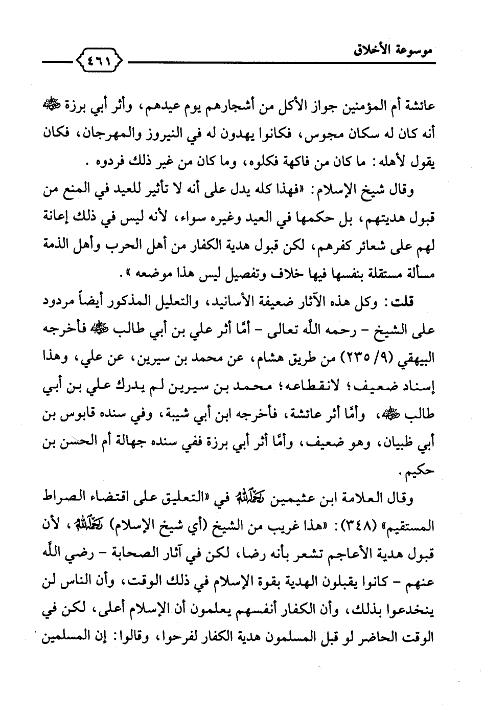 وقال العلامة ابن عثيمين -رحمه الله- في "التعليق على اقتضاء الصراط المستقيم" (348): "هذا غريب من الشيخ (أي شيخ الإسلام) -رحمه الله-، لأن قبول هدية الأعاجم تشعر بأنه رضا، لكن في آثار الصحابة -رضي الله عنهم- كانوا يقبلون الهدية بقوة الإسلام في ذلك الوقت، وأن الناس لن ينخدعوا بذلك، وأن الكفار أنفسهم يعلمون أن الإسلام أعلى، لكن في الوقت الحاضر لو قبل المسلمون هدية الكفار لفرحوا، وقالوا: إن المسلمين