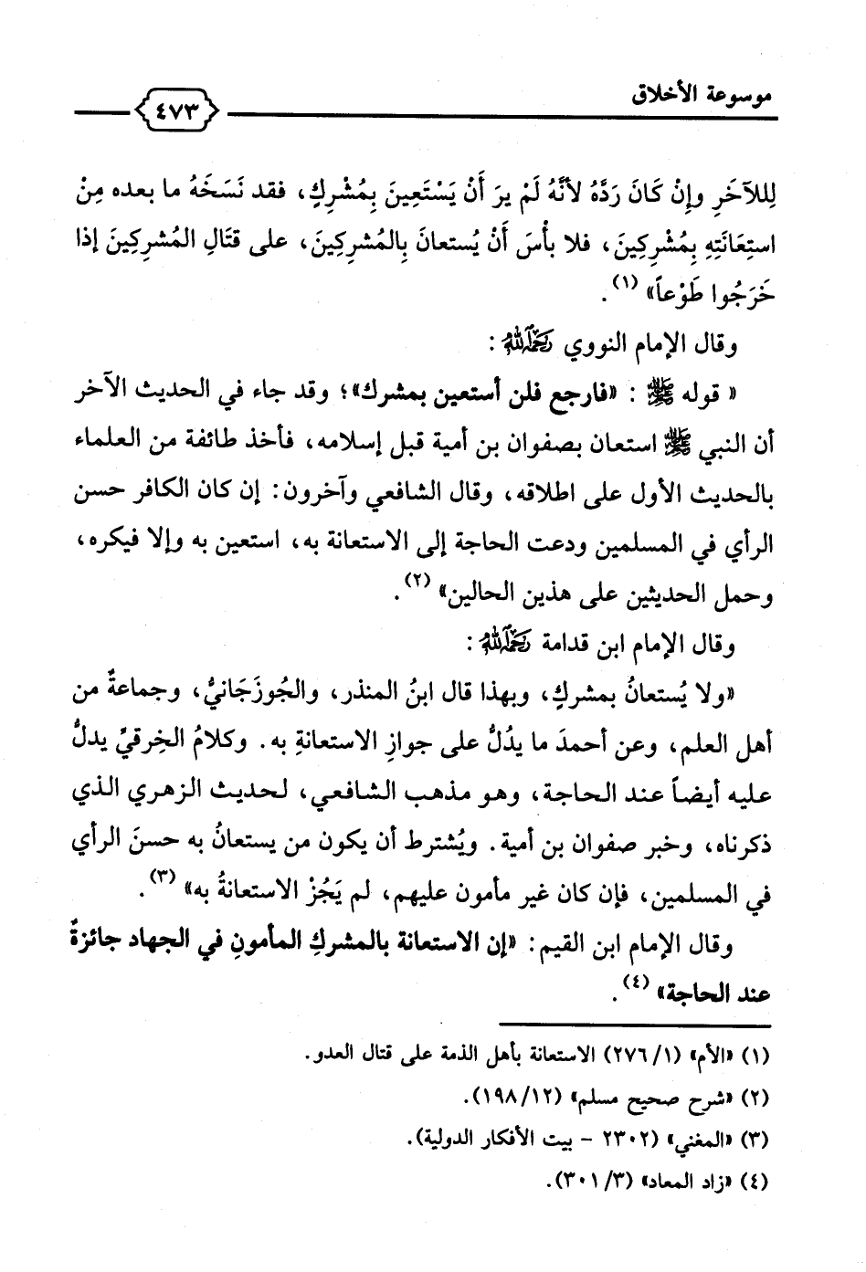 "ولا يُستعانُ بمشركٍ، وبهذا قال ابنُ المنذر، والجُوزَجَانيُّ، وجماعةٌ من أهل العلم، وعن أحمدَ ما يدُلُّ على جوازِ الاستعانةِ به. وكلامُ الخِرقيِّ يدلُّ عليه أيضاً عند الحاجة، وهو مذهب الشافعي، لحديث الزهري الذي ذكرناه، وخبر صفوان بن أمية. وُيشترط أن يكون من يستعانُ به حسنَ الرأي في المسلمين، فإن كان غير مأمون عليهم، لم يَجُزْ الاستعانةُ به" (¬3).