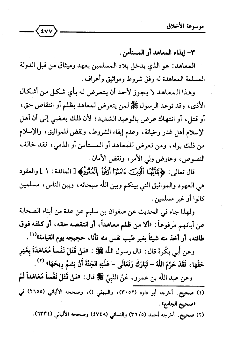 وهذا المعاهد لا يجوز لأحد أن يتعرض له بأي شكل من أشكال الأذى، وقد توعد الرسول - صلى الله عليه وسلم - لمن يتعرض لمعاهد بظلم أو انتقاص حق، أو قتل، أو انتهاك عرض بالوعيد الشديد؛ لأن ذلك يفضي إلى أن أهل الإسلام أهل غدر وخيانة، وعدم إيفاء الشروط، ونقض للمواثيق، والإسلام من ذلك براء، ومن تعرض للمعاهد أو المستأمن أو الذمي، فقد خالف النصوص، وعارض ولي الأمر، ونقض الأمان.