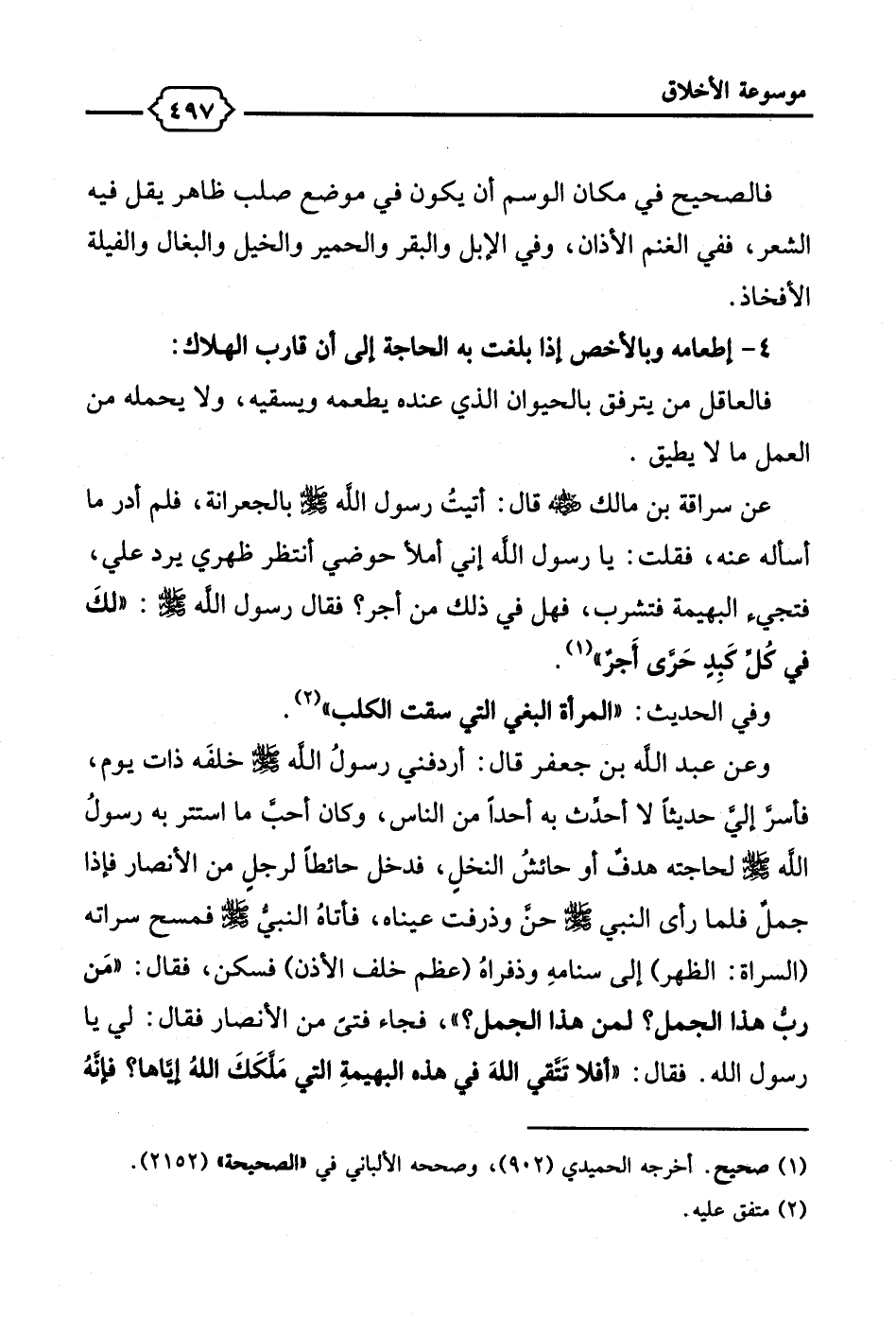وعن عبد الله بن جعفر قال: أردفني رسولُ الله - صلى الله عليه وسلم - خلفَه ذات يوم، فأسرَّ إليَّ حديثاً لا أحدِّث به أحدًا من الناس، وكان أحب ما استتر به رسولُ الله - صلى الله عليه وسلم - لحاجته هدفٌ أو حائشُ النخلِ، فدخل حائطًا لرجلٍ من الأنصار فإذا جمل فلما رأى النبي - صلى الله عليه وسلم - حنَّ وذرفت عيناه، فأتاهُ النبي - صلى الله عليه وسلم - فمسح سراته (السراة: الظهر) إلى سنامهِ وذفراهُ (عظم خلف الأذن) فسكن، فقال: "مَن ربُّ هذا الجمل؟ لمن هذا الجمل؟ "، فجاء فتًى من الأنصار فقال: لي يا رسول الله. فقال: "أفلا تَتقي اللهَ في هذه البهيمةِ التي مَلَّكَكَ اللهُ إياها؟ فإنهُ