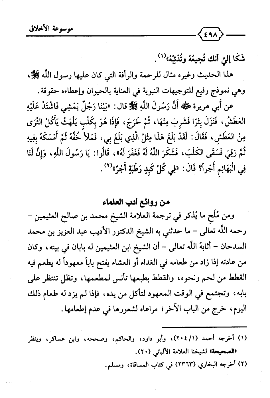 ومن مُلَحِ ما يُذكر في ترجمة العلامة الشيخ محمد بن صالح العثيمين -رحمه الله تعالى- ما حدثني به الشيخ الدكتور الأديب عبد العزيز بن محمد السدحان -أثابهُ الله تعالى- أن الشيخ ابن العثيمين له بابان في بيته، وكان من عادته إذا زاد من طعامه في الغداء أو العشاء يفتح بابًا معهوداً له يطعم فيه القطط من لحم ونحوه، والقطط بطبعها تأنس لمطعمها، وتظل تنتظر على بابه، وتجتمع في الوقت المعهود لتأكل من يده، فإذا لم يزد له طعام ذلك اليوم، خرج من الباب الآخر؛ مراعاه لشعورها في عدم إطعامها.