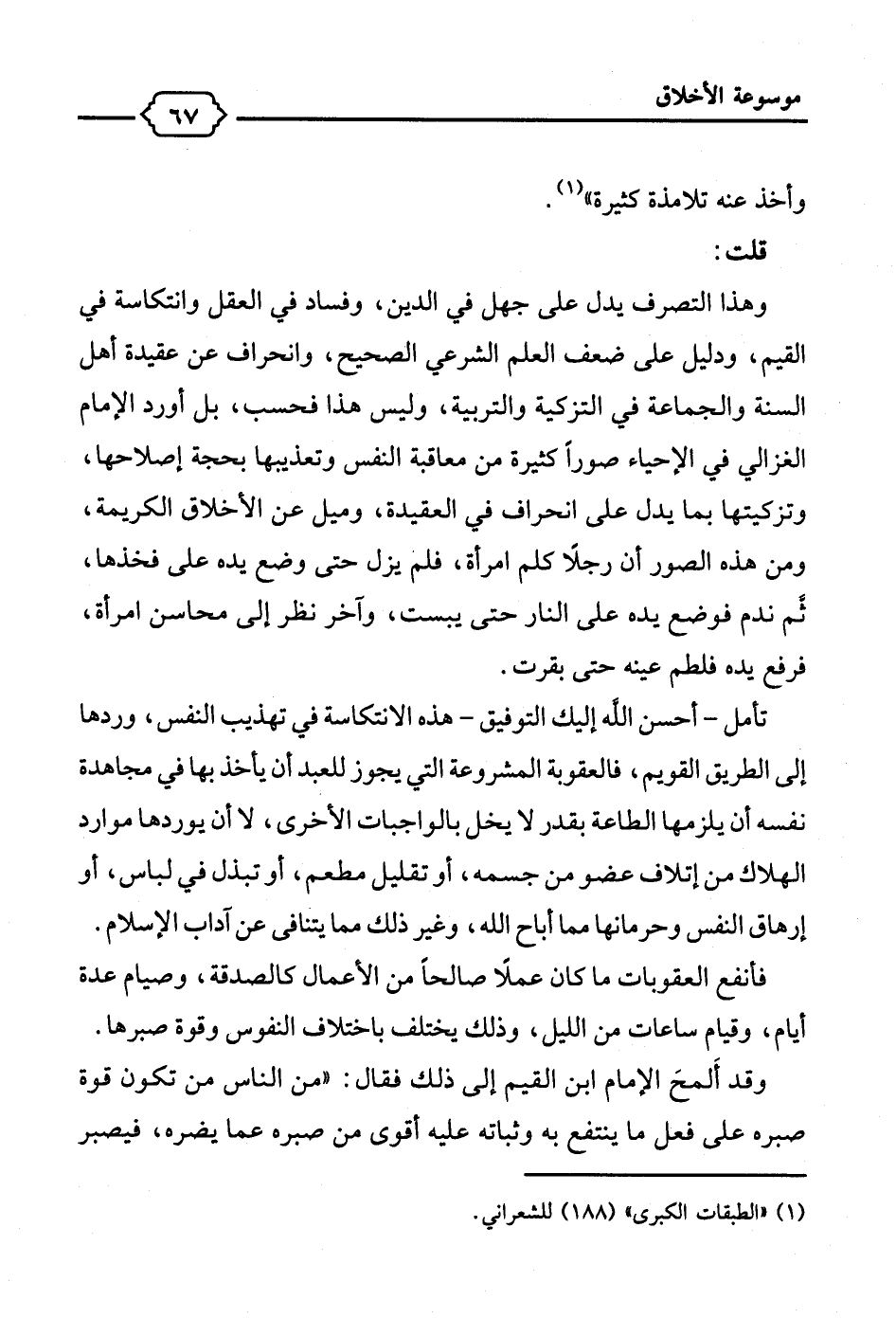 تأمل -أحسن الله إليك التوفيق- هذه الانتكاسة في تهذيب النفس، وردها إلى الطريق القويم، فالعقوبة المشروعة التي يجوز للعبد أن يأخذ بها في مجاهدة نفسه أن يلزمها الطاعة بقدر لا يخل بالواجبات الأخرى، لا أن يوردها موارد الهلاك من إتلاف عضو من جسمه، أو تقليل مطعم، أو تبذل في لباس، أو إرهاق النفس وحرمانها مما أباح الله، وغير ذلك مما يتنافى عن آداب الإسلام.