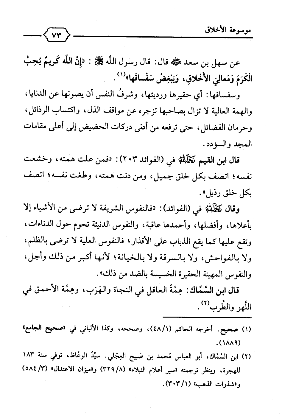 عن سهل بن سعد - رضي الله عنه - قال: قال رسول الله - صلى الله عليه وسلم -: "إِنَّ الله كَريم يُحب الكَرَمَ وَمَعاليَ الأَخلاقِ، وَيبغِضُ سَفسافَها" (¬1).
