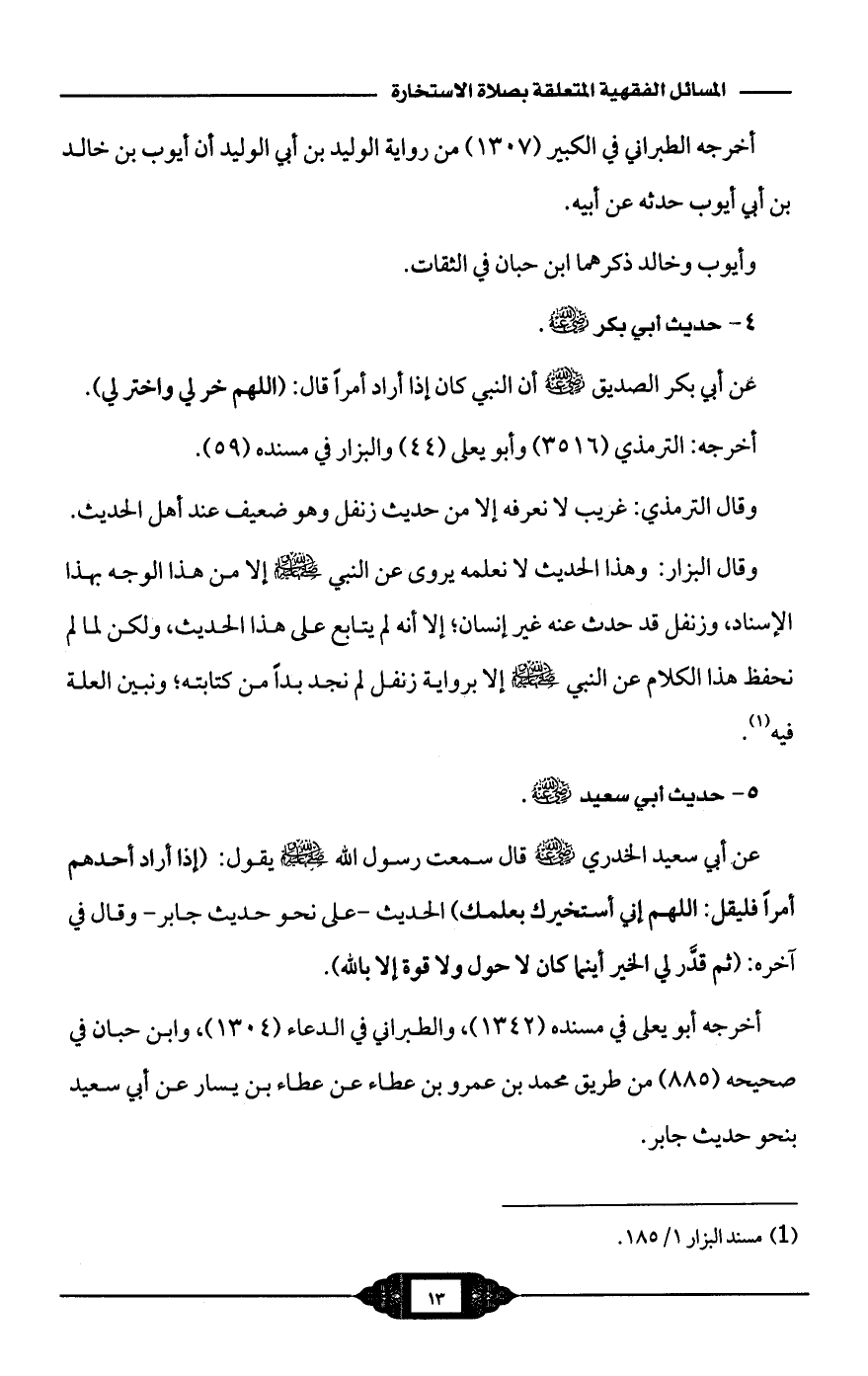 عن أبي سعيد الخدري - رضي الله عنه - قال سمعت رسول الله - صلى الله عليه وسلم - يقول: «إذا أراد أحدهم أمرًا فليقل: اللهم إني أستخيرك بعلمك» الحديث - على نحو حديث جابر - وقال في آخره: «ثم قدر لي الخير أينما كان لا حول ولا قوة إلا بالله».