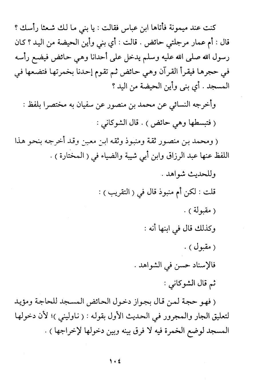 كنت عند ميمونة فأتاها ابن عباس فقالت: يا بني ما لك شعثا رأسك؟ قال: أم عمار مرجلتي حائض. قالت: أي بني وأين الحيضة من اليد؟ كان رسول الله صلى الله عليه وسلم يدخل على أحدانا وهي حائض فيضع رأسه في حجرها فيقرأ القرآن وهي حائض ثم تقوم إحدنا بخمرتها فتضعها في المسجد. أي بنى وأين الحيضة من اليد؟