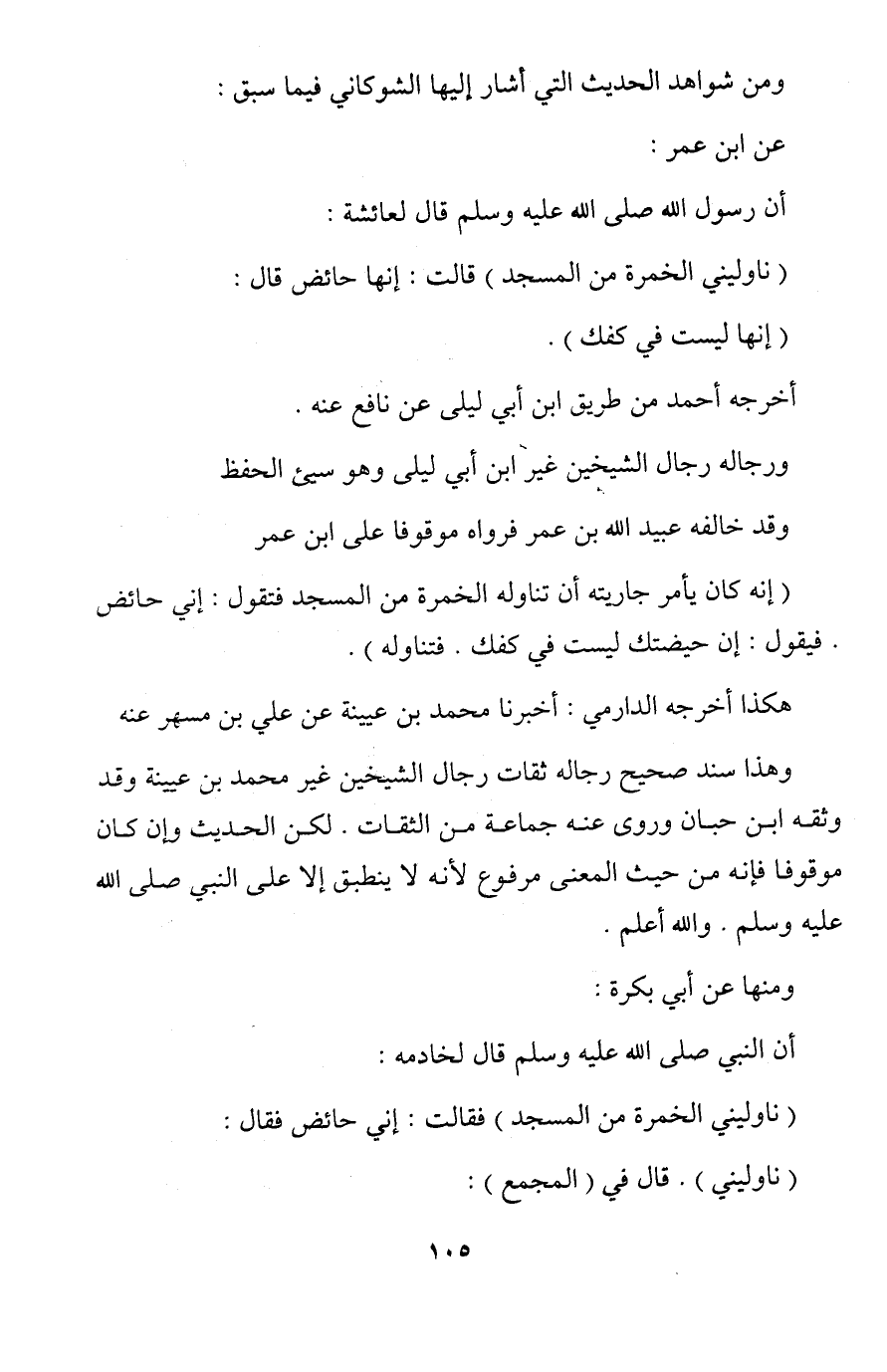 (إنه كان يأمر جاريته أن تناوله الخمرة من المسجد فتقول: إني حائض. فيقول: إن حيضتك ليست في كفك. فتناوله).