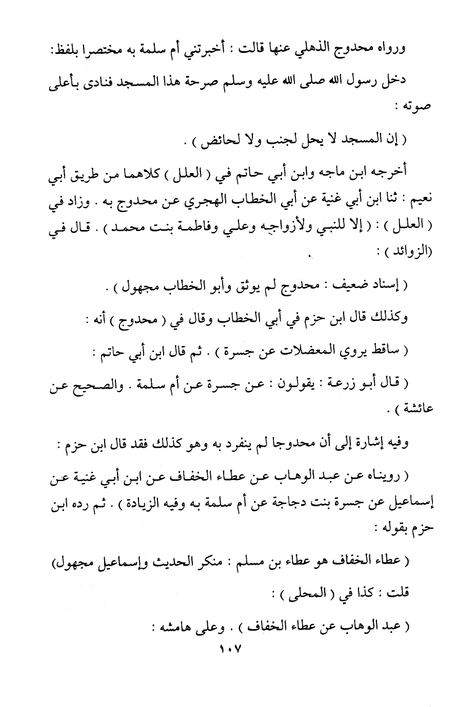 (رويناه عن عبد الوهاب عن عطاء الخفاف عن ابن أبي غنية عن إسماعيل عن جسرة بنت دجاجة عن أم سلمة به وفيه الزيادة). ثم رده ابن حزم بقوله: