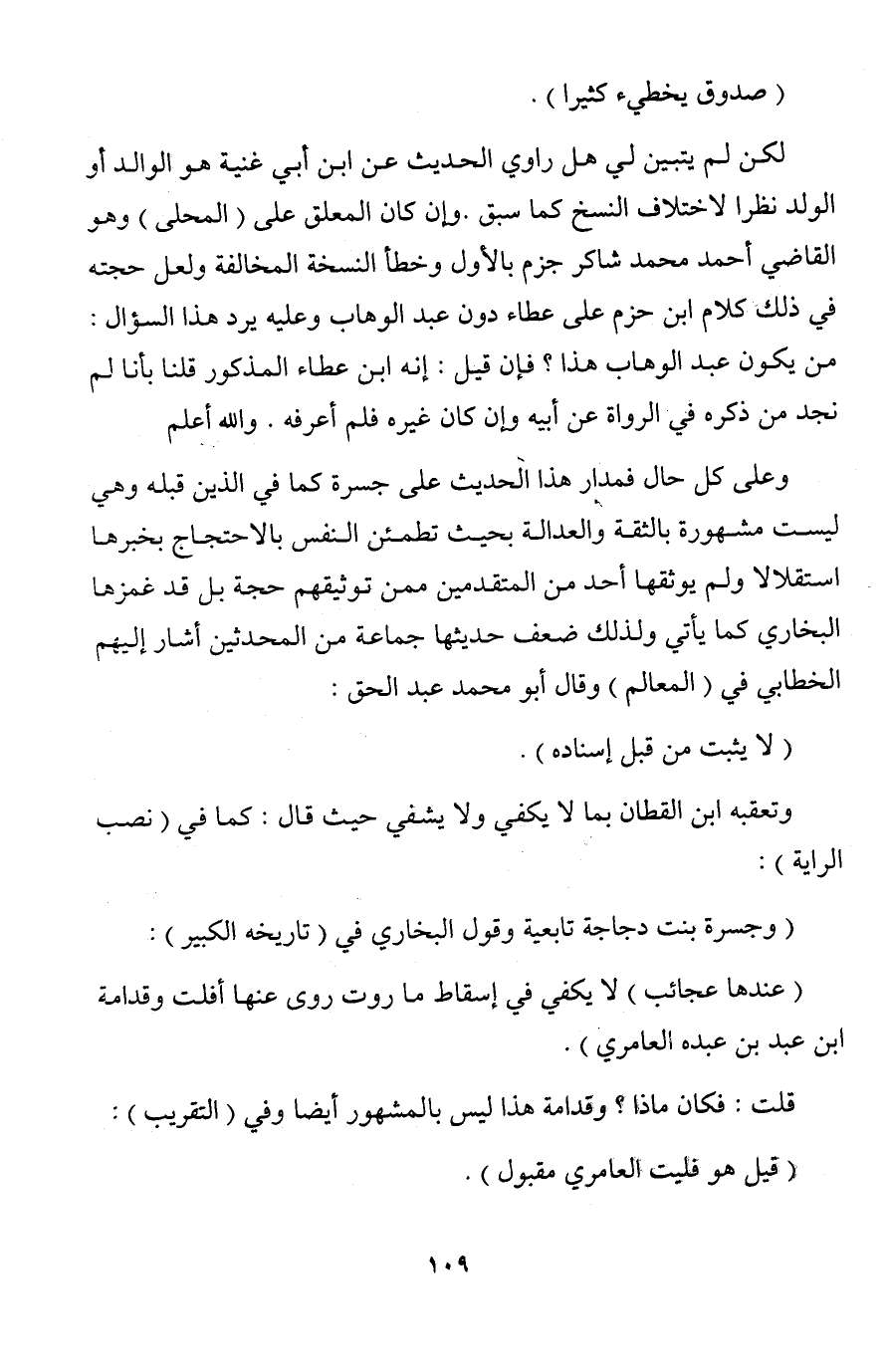 لكن لم يتبين لي هل راوي الحديث عن ابن أبي غنية هو الوالد أو الولد نظرا لاختلاف النسخ كما سبق. وإن كان المعلق على (المحلى) وهو القاضي أحمد محمد شاكر جزم بالأول وخطأ النسخة المخالفة ولعل حجته في ذلك كلام ابن حزم على عطاء دون عبد الوهاب وعليه يرد هذا السؤال: من يكون عبد الوهاب هذا؟ فإن قيل: إنه ابن عطاء المذكور قلنا بأنا لم نجد من ذكره في الرواة عن أبيه وإن كان غيره فلم أعرفه. والله أعلم