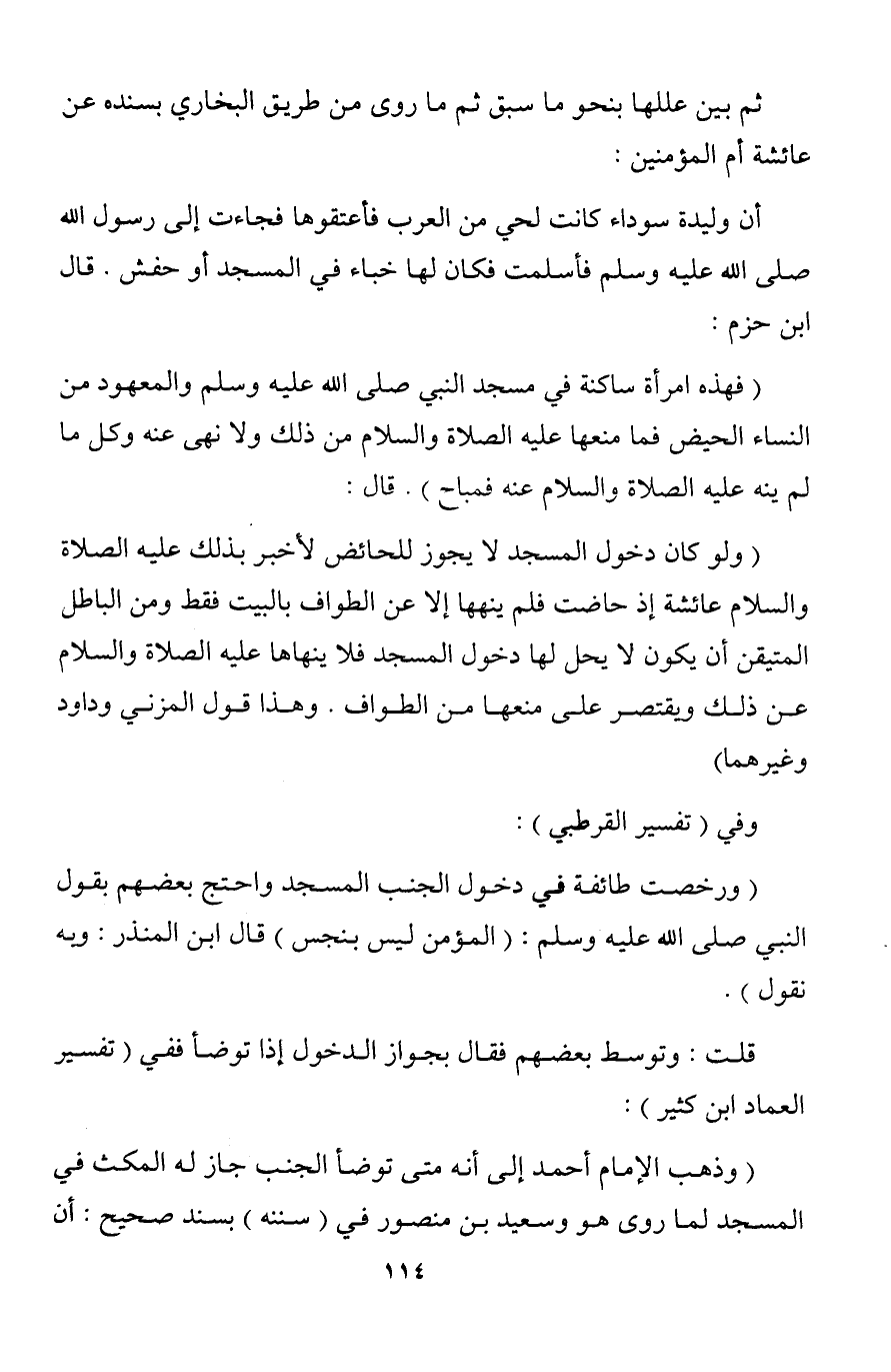 (ولو كان دخول المسجد لا يجوز للحائض لأخبر بذلك عليه الصلاة والسلام عائشة إذ حاضت فلم ينهها إلا عن الطواف بالبيت فقط ومن الباطل المتيقن أن يكون لا يحل لها دخول المسجد فلا ينهاها عليه الصلاة والسلام عن ذلك ويقتصر على منعها من الطواف. وهذا قول المزني وداود وغيرهما)