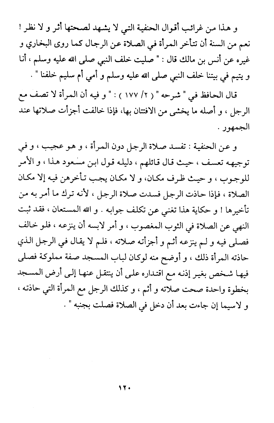 وهذا من غرائب أقوال الحنفية التي لا يشهد لصحتها أثر ولا نظر! نعم من السنة أن تتأخر المرأة في الصلاة عن الرجال كما روى البخاري وغيره عن أنس بن مالك قال: " صليت خلف النبي صلى الله عليه وسلم، أنا ويتيم في بيتنا خلف النبي صلى الله عليه وسلم وأمي أم سليم خلفنا ".