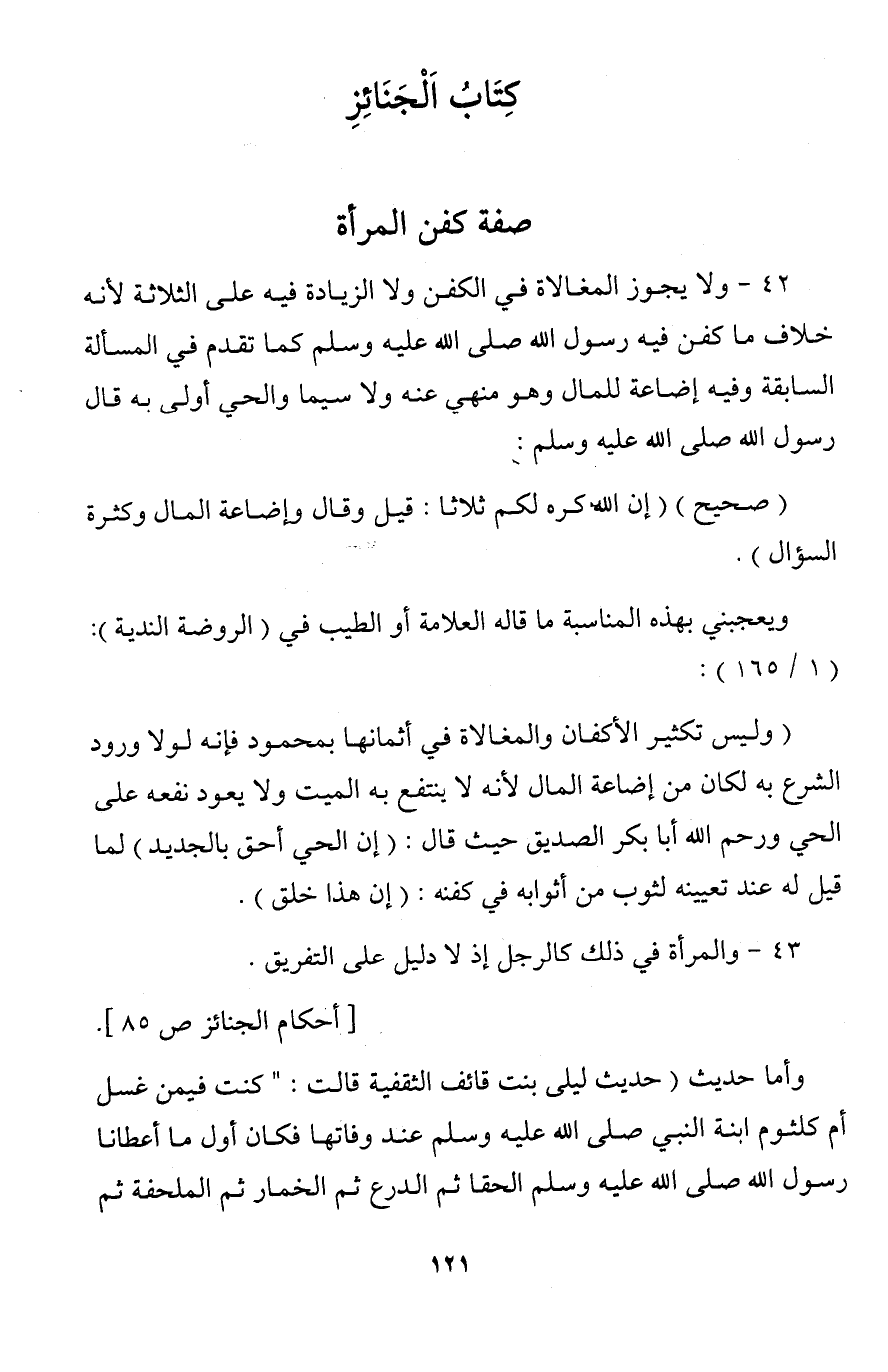 42 - ولا يجوز المغالاة في الكفن ولا الزيادة فيه على الثلاثة لأنه خلاف ما كفن فيه رسول الله صلى الله عليه وسلم كما تقدم في المسألة السابقة وفيه إضاعة للمال وهو منهي عنه ولا سيما والحي أولى به قال رسول الله صلى الله عليه وسلم: