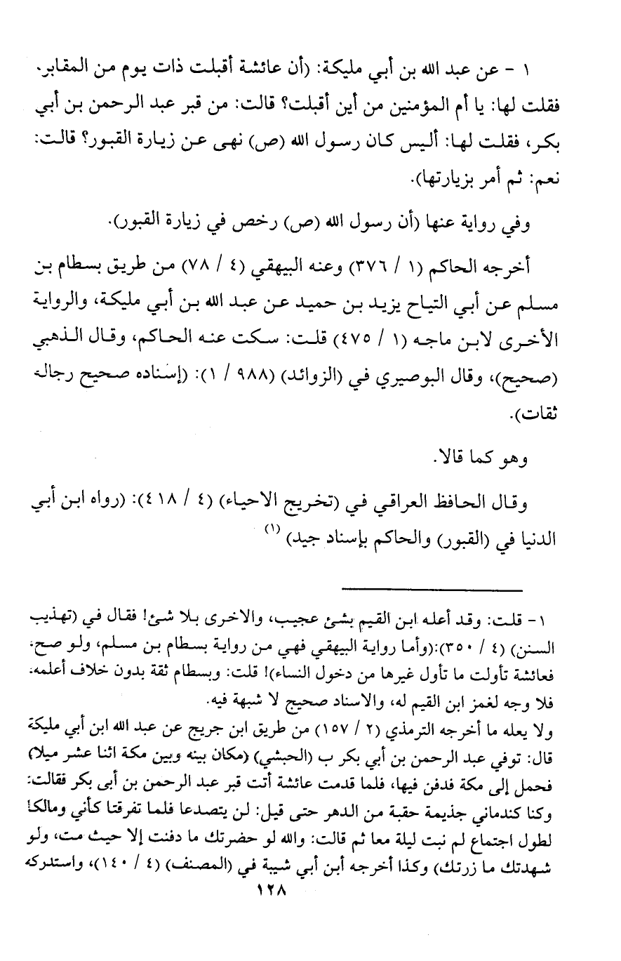 1 - عن عبد الله بن أبي مليكة: (أن عائشة أقبلت ذات يوم من المقابر، فقلت لها: يا أم المؤمنين من أين أقبلت؟ قالت: من قبر عبد الرحمن بن أبي بكر، فقلت لها: أليس كان رسول الله (ص) نهى عن زيارة القبور؟ قالت: نعم: ثم أمر بزيارتها).