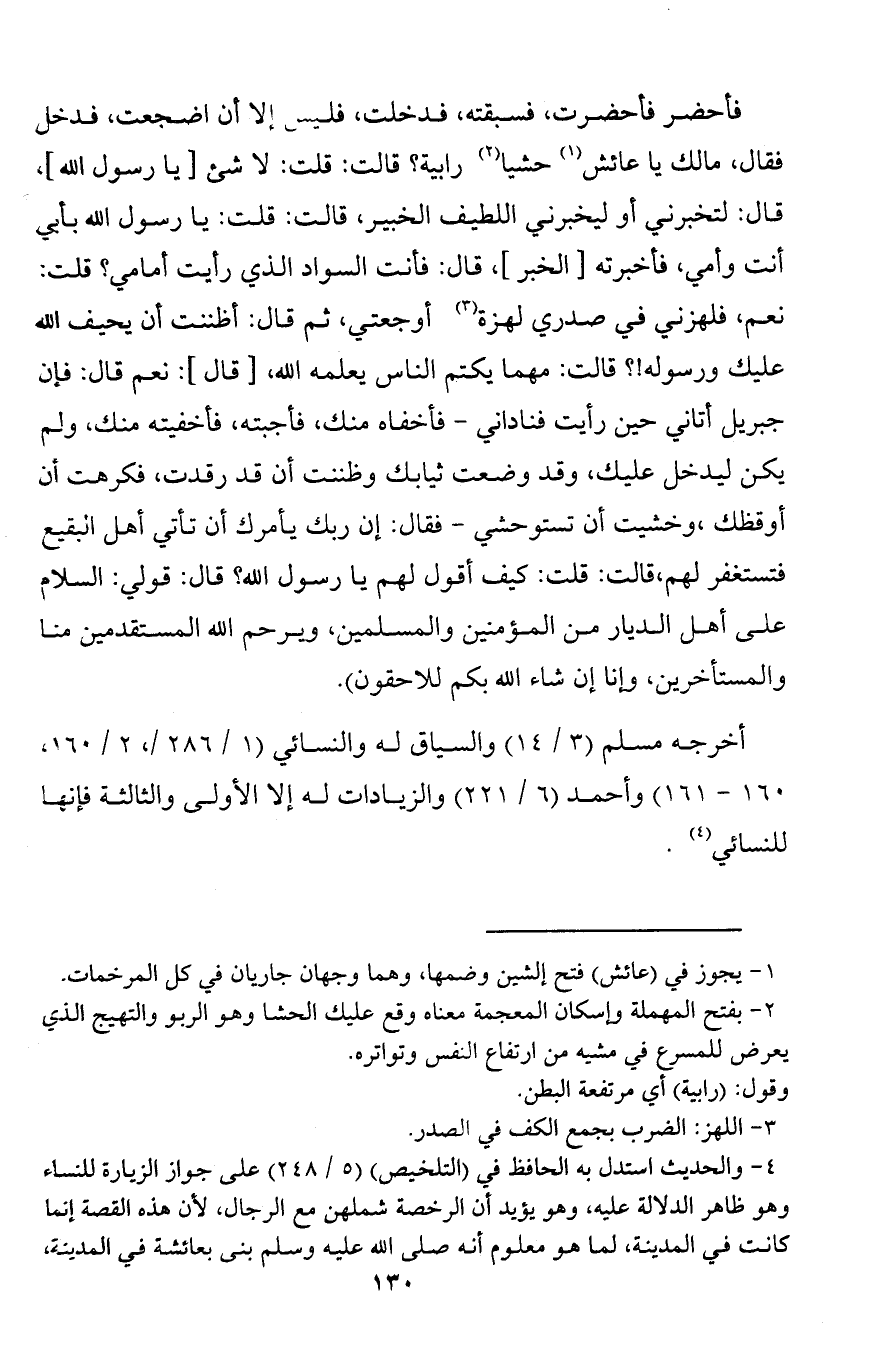 (¬4) 4 - والحديث استدل به الحافظ في (التلخيص) (5/ 248) على جواز الزيارة للنساء وهو ظاهر الدلالة عليه، وهو يؤيد أن الرخصة شملهن مع الرجال، لأن هذه القصة إنما كانت في المدينة، لما هو معلوم أنه صلى الله عليه وسلم بنى بعائشة في المدينة،