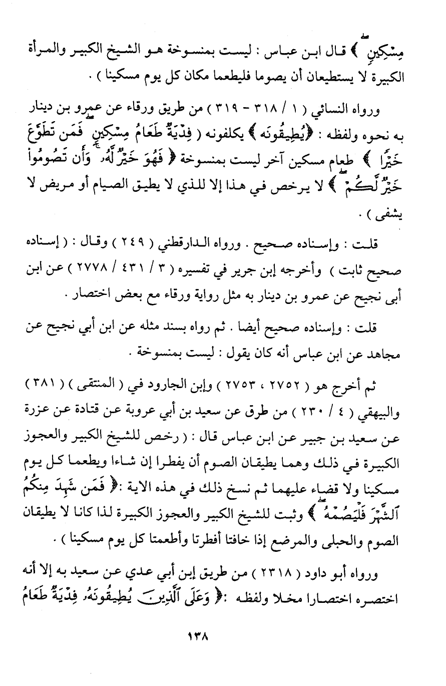 ورواه النسائي (1/ 318 - 319) من طريق ورقاء عن عمرو بن دينار به نحوه ولفظه: {يُطِيقُونَهُ} يكلفونه {فِدْيَةٌ طَعَامُ مِسْكِينٍ فَمَنْ تَطَوَّعَ خَيْراً} طعام مسكين آخر ليست بمنسوخة {فَهُوَ خَيْرٌ لَهُ وَأَنْ تَصُومُوا خَيْرٌ لَكُمْ} لا يرخص في هذا إلا للذي لا يطيق الصيام أو مريض لا يشفى).