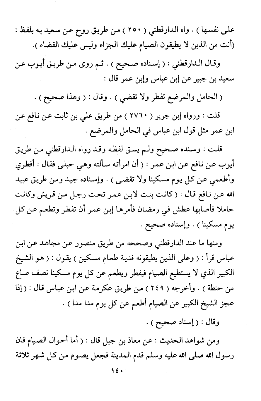 قلت: وسنده صحيح ولم يسق لفظه وقد رواه الدارقطني من طريق أيوب عن نافع عن ابن عمر: (أن امرأته سألته وهي حبلى فقال: أفطري وأطعمي عن كل يوم مسكينا ولا تقضى). وإسناده جيد ومن طريق عبيد الله عن نافع قال: (كانت بنت لابن عمر تحت رجل من قريش وكانت حاملا فأصابها عطش في رمضان فأمرها إبن عمر أن تفطر وتطعم عن كل يوم مسكينا). وإسناده صحيح.