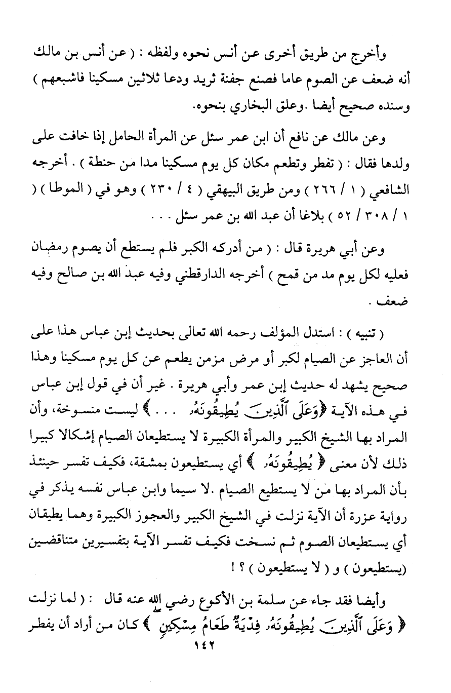 (تنبيه): استدل المؤلف رحمه الله تعالى بحديث إبن عباس هذا على أن العاجز عن الصيام لكبر أو مرض مزمن يطعم عن كل يوم مسكينا وهذا صحيح يشهد له حديث إبن عمر وأبي هريرة. غير أن في قول إبن عباس في هذه الآية {وَعَلَى الَّذِينَ يُطِيقُونَهُ ... } ليست منسوخة, وأن المراد بها الشيخ الكبير والمرأة الكبيرة لا يستطيعان الصيام إشكالا كبيرا ذلك لأن معنى {يُطِيقُونَهُ} أي يستطيعون بمشقة, فكيف تفسر حينئذ بأن المراد بها من لا يستطيع الصيام. لا سيما وابن عباس نفسه يذكر في رواية عزرة أن الآية نزلت في الشيخ الكبير والعجوز الكبيرة وهما يطيقان أي يستطيعان الصوم ثم نسخت فكيف تفسر الآية بتفسيرين متناقضين (يستطيعون) و (لا يستطيعون)؟!