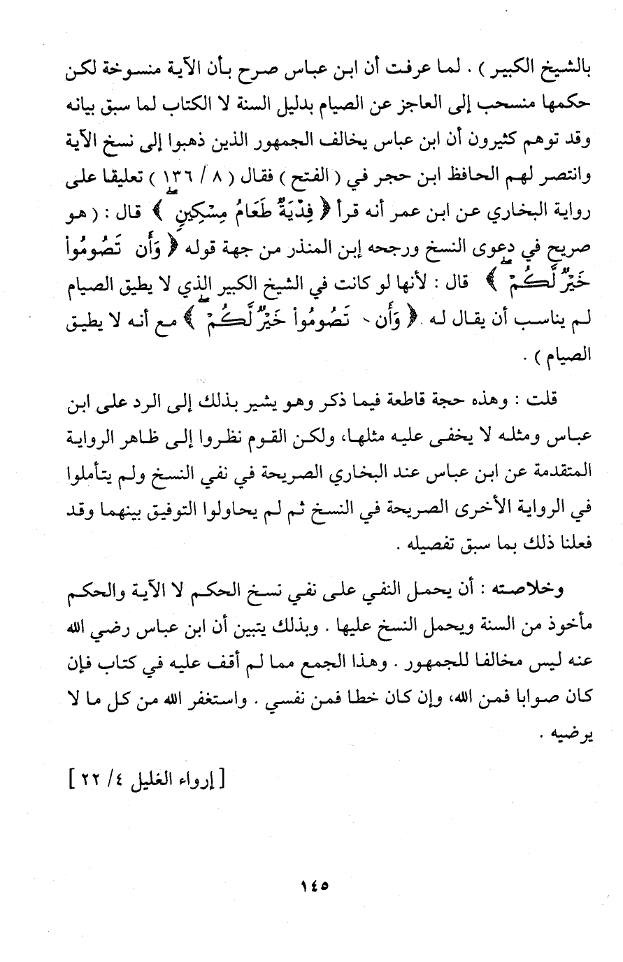 بالشيخ الكبير). لما عرفت أن ابن عباس صرح بأن الآية منسوخة لكن حكمها منسحب إلى العاجز عن الصيام بدليل السنة لا الكتاب لما سبق بيانه وقد توهم كثيرون أن ابن عباس يخالف الجمهور الذين ذهبوا إلى نسخ الآية وانتصر لهم الحافظ ابن حجر في (الفتح) فقال (8/ 136) تعليقا على رواية البخاري عن ابن عمر أنه قرأ {فِدْيَةٌ طَعَامُ مِسْكِينٍ} قال: (هو صريح في دعوى النسخ ورجحه إبن المنذر من جهة قوله {وَأَنْ تَصُومُوا خَيْرٌ لَكُمْ} قال: لأنها لو كانت في الشيخ الكبير الذي لا يطيق الصيام لم يناسب أن يقال له {وَأَنْ تَصُومُوا خَيْرٌ لَكُمْ} مع أنه لا يطيق الصيام).