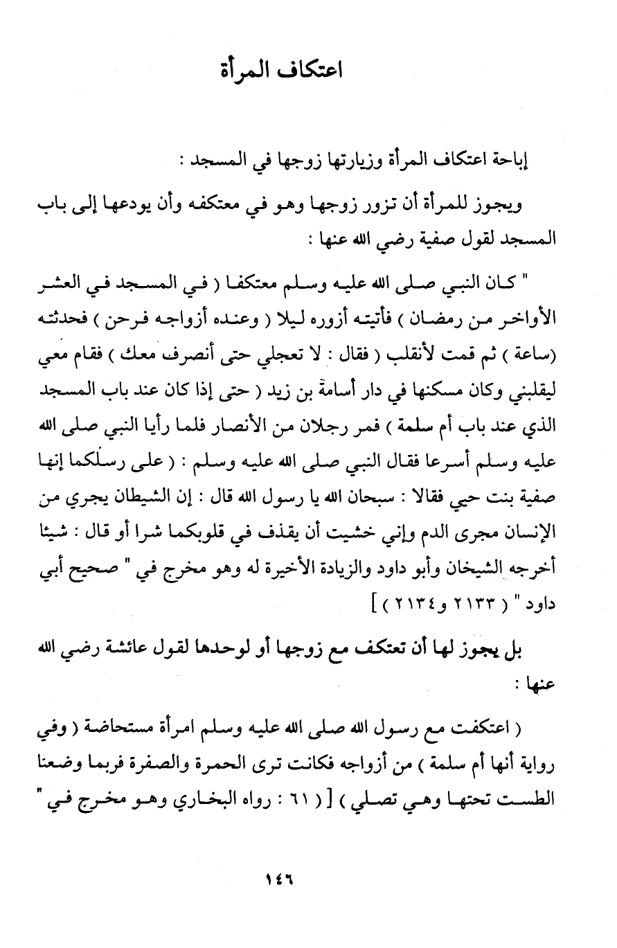 " كان النبي صلى الله عليه وسلم معتكفا (في المسجد في العشر الأواخر من رمضان) فأتيته أزوره ليلا (وعنده أزواجه فرحن) فحدثته (ساعة) ثم قمت لأنقلب (فقال: لا تعجلي حتى أنصرف معك) فقام معي ليقلبني وكان مسكنها في دار أسامة بن زيد (حتى إذا كان عند باب المسجد الذي عند باب أم سلمة) فمر رجلان من الأنصار فلما رأيا النبي صلى الله عليه وسلم أسرعا فقال النبي صلى الله عليه وسلم: (على رسلكما إنها صفية بنت حيي فقالا: سبحان الله يا رسول الله قال: إن الشيطان يجري من الإنسان مجرى الدم وإني خشيت أن يقذف في قلوبكما شرا أو قال: شيئا أخرجه الشيخان وأبو داود والزيادة الأخيرة له وهو مخرج في " صحيح أبي داود " (2133 و2134)]