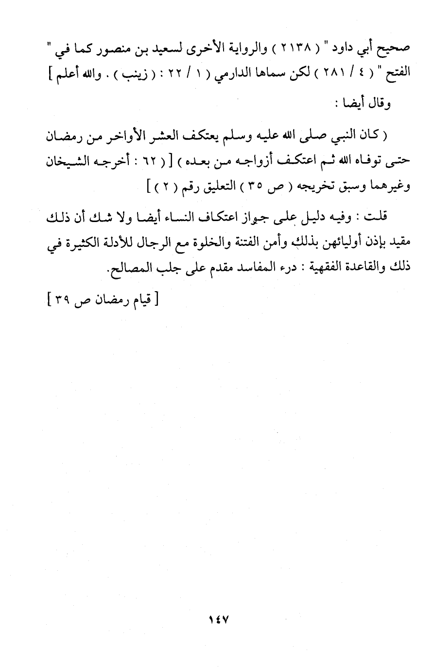قلت: وفيه دليل على جواز اعتكاف النساء أيضا ولا شك أن ذلك مقيد بإذن أوليائهن بذلك وأمن الفتنة والخلوة مع الرجال للأدلة الكثيرة في ذلك والقاعدة الفقهية: درء المفاسد مقدم على جلب المصالح.