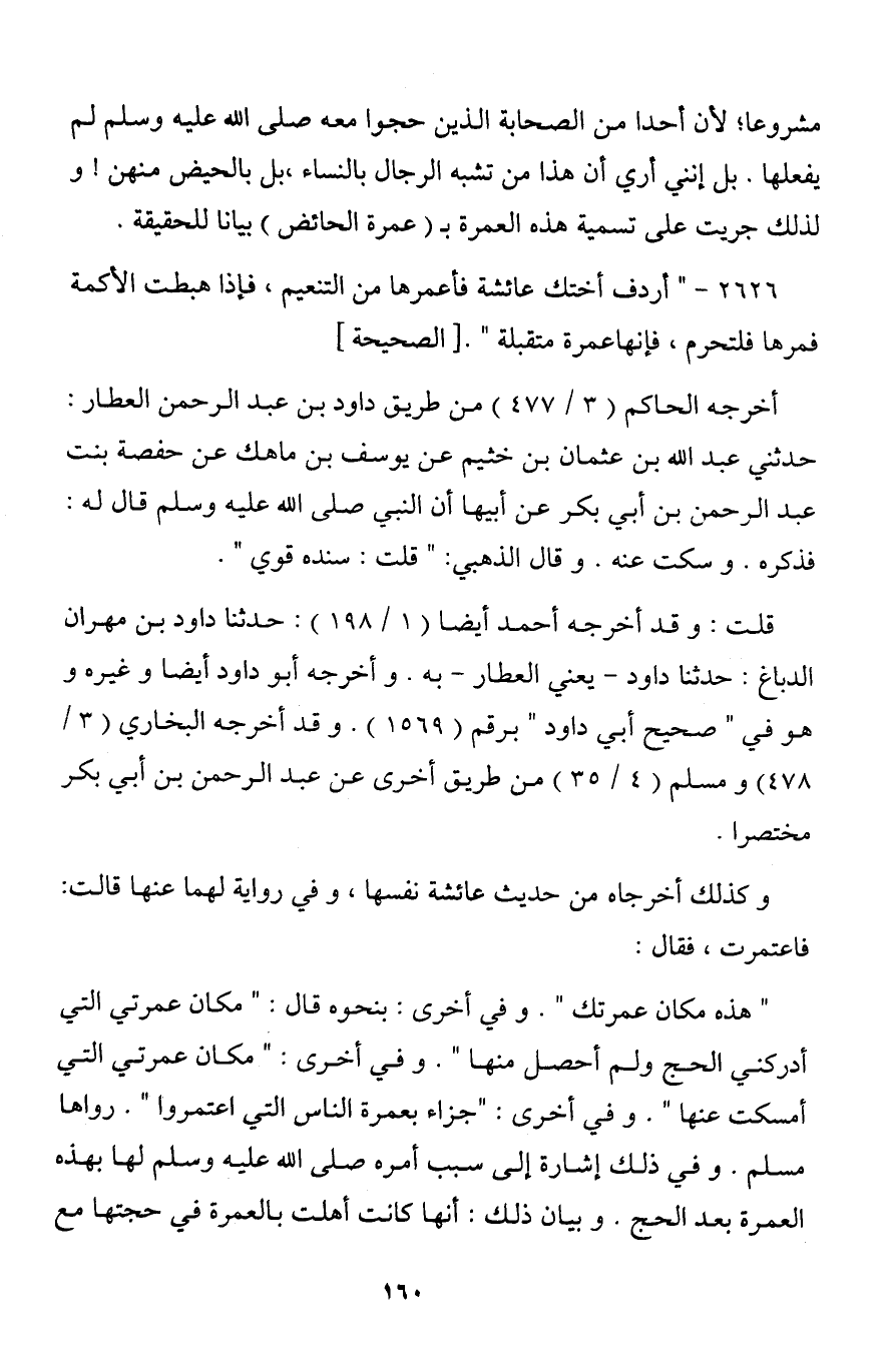 2626 - " أردف أختك عائشة فأعمرها من التنعيم، فإذا هبطت الأكمة فمرها فلتحرم، فإنهاعمرة متقبلة ". [الصحيحة]