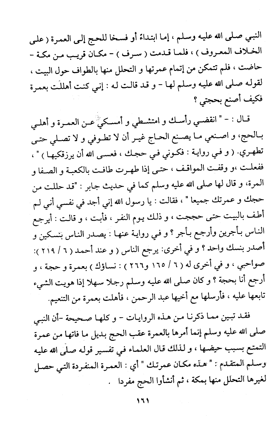 فقد تبين مما ذكرنا من هذه الروايات - وكلها صحيحة -أن النبي صلى الله عليه وسلم إنما أمرها بالعمرة عقب الحج بديل ما فاتها من عمرة التمتع بسبب حيضها، ولذلك قال العلماء في تفسير قوله صلى الله عليه وسلم المتقدم: " هذه مكان عمرتك " أي: العمرة المنفردة التي حصل لغيرها التحلل منها بمكة، ثم أنشأوا الحج مفردا.