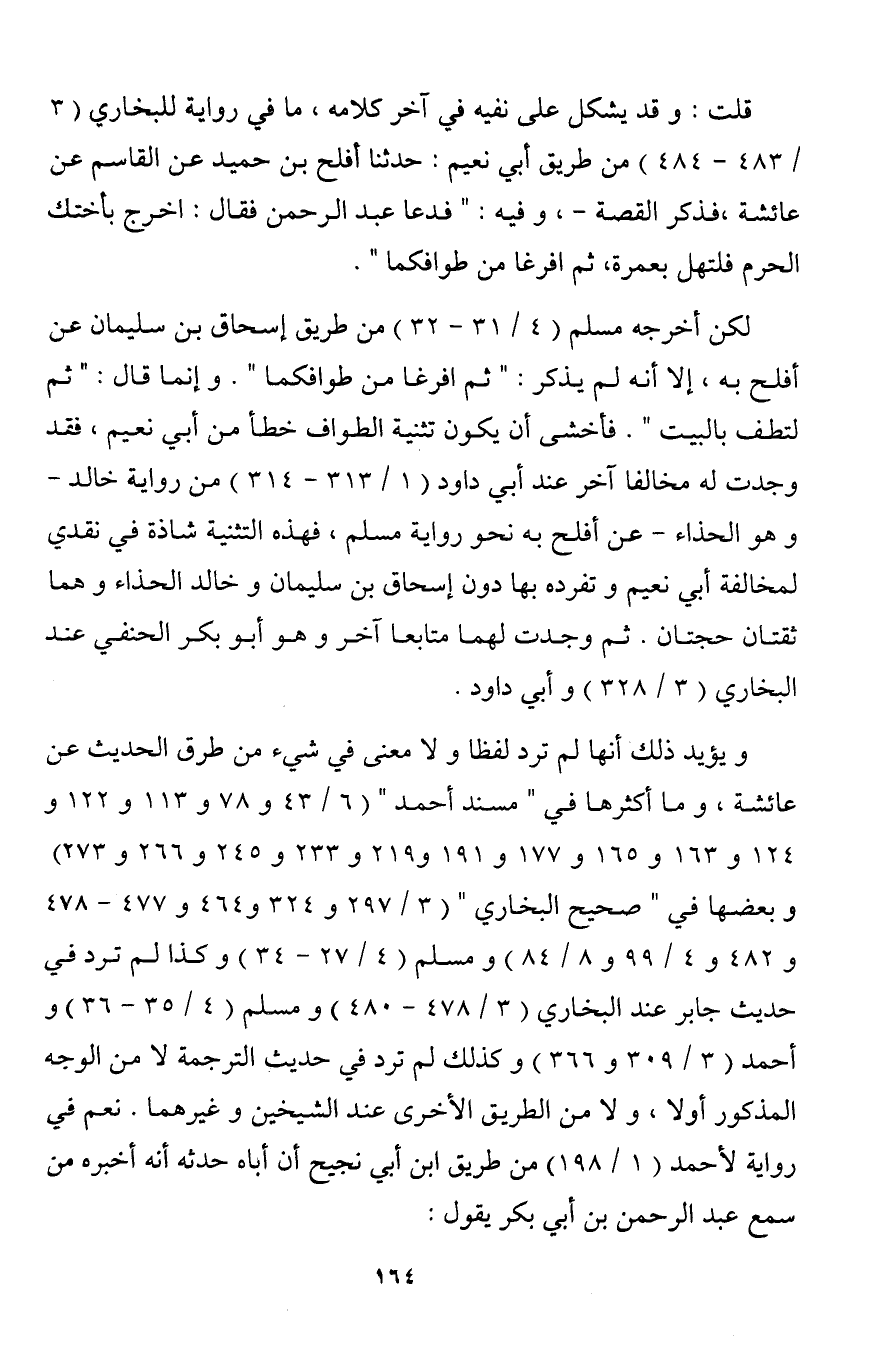 لكن أخرجه مسلم (4/ 31 - 32) من طريق إسحاق بن سليمان عن أفلح به، إلا أنه لم يذكر: " ثم افرغا من طوافكما ". وإنما قال: " ثم لتطف بالبيت ". فأخشى أن يكون تثنية الطواف خطأ من أبي نعيم، فقد وجدت له مخالفا آخر عند أبي داود (1/ 313 - 314) من رواية خالد - وهو الحذاء - عن أفلح به نحو رواية مسلم، فهذه التثنية شاذة في نقدي لمخالفة أبي نعيم وتفرده بها دون إسحاق بن سليمان وخالد الحذاء وهما ثقتان حجتان. ثم وجدت لهما متابعا آخر وهو أبو بكر الحنفي عند البخاري (3/ 328) وأبي داود.