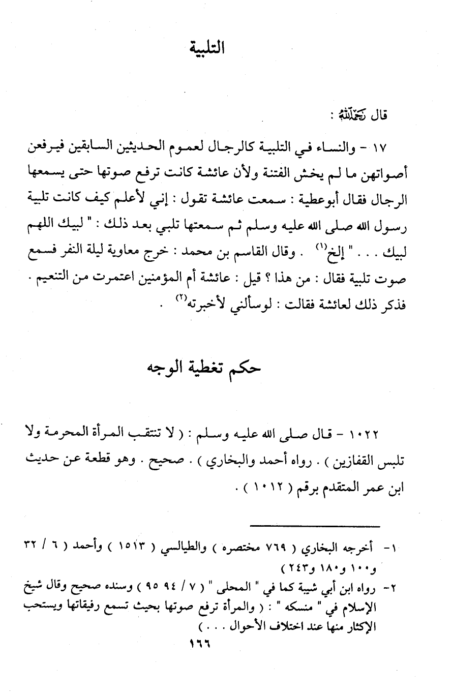 (¬2) 2 - رواه ابن أبي شيبة كما في " المحلى " (7/ 94 95) وسنده صحيح وقال شيخ الإسلام في " منسكه ": (والمرأة ترفع صوتها بحيث تسمع رفيقاتها ويستحب الإكثار منها عند اختلاف الأحوال. . .)
