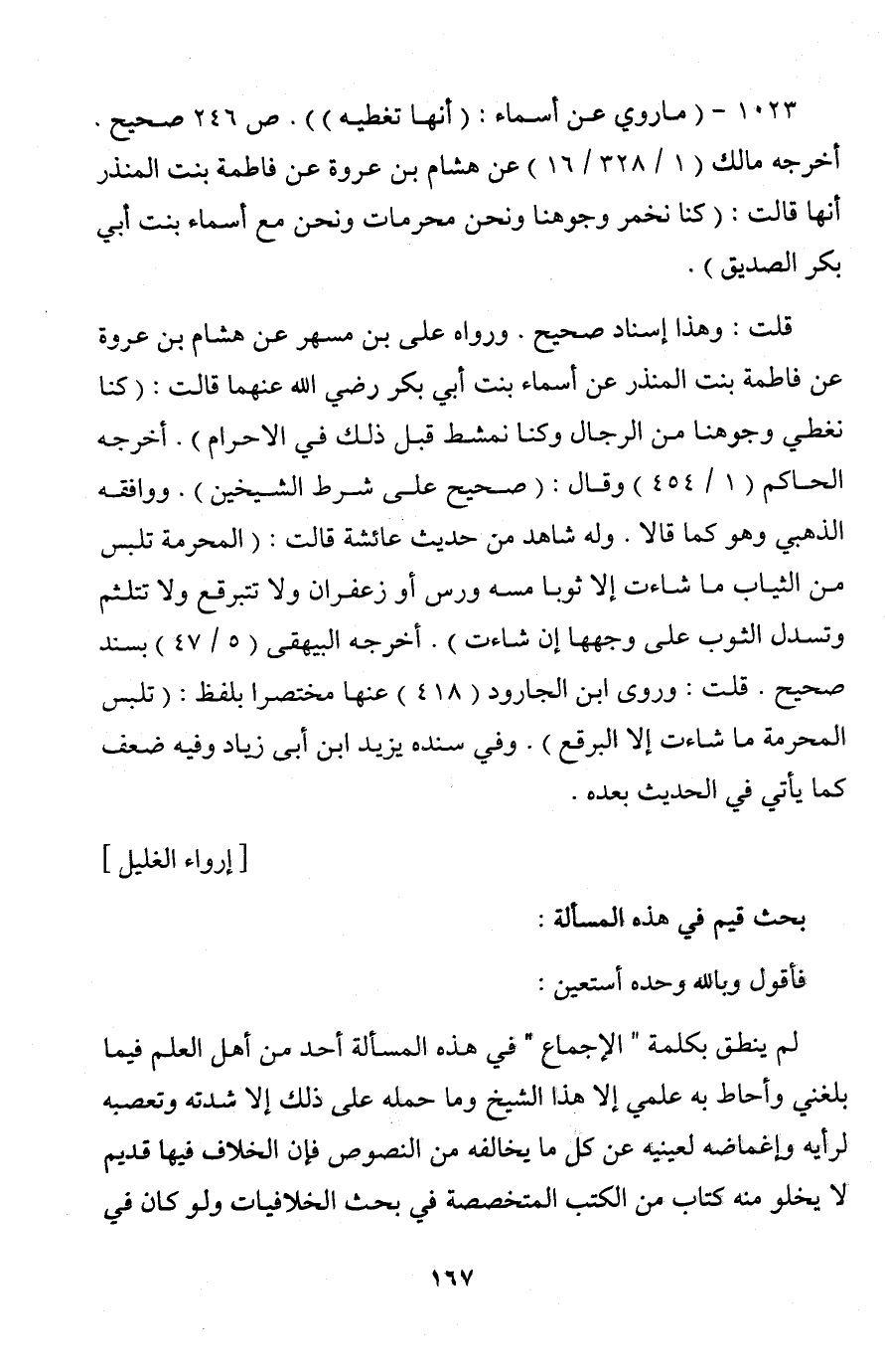 1023 - (ماروي عن أسماء: (أنها تغطيه)). ص 246 صحيح. أخرجه مالك (1/ 328 / 16) عن هشام بن عروة عن فاطمة بنت المنذر أنها قالت: (كنا نخمر وجوهنا ونحن محرمات ونحن مع أسماء بنت أبي بكر الصديق).