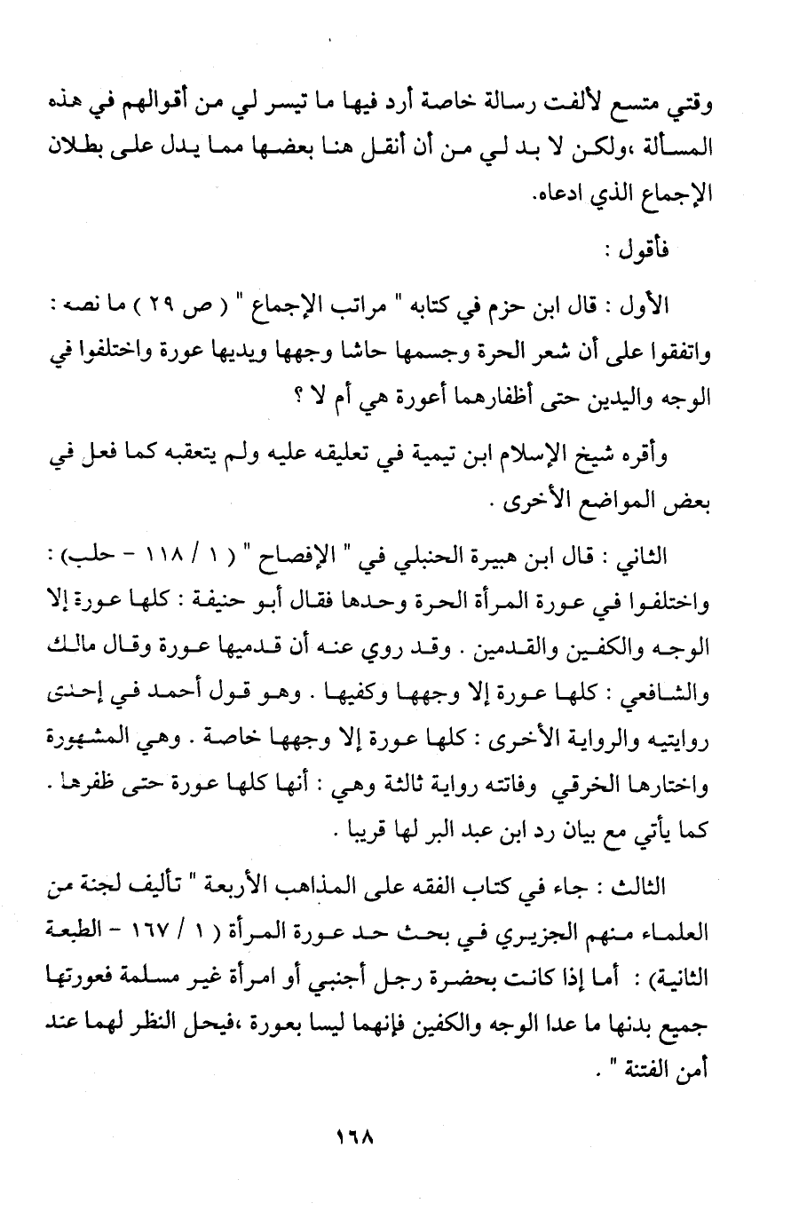 الأول: قال ابن حزم في كتابه " مراتب الإجماع " (ص 29) ما نصه: واتفقوا على أن شعر الحرة وجسمها حاشا وجهها ويديها عورة واختلفوا في الوجه واليدين حتى أظفارهما أعورة هي أم لا؟