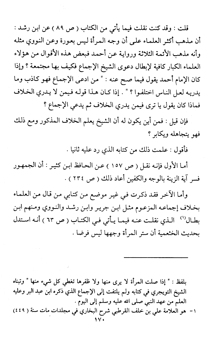 قلت: وقد كنت نقلت فيما يأتي من الكتاب (ص 89) عن ابن رشد: أن مذهب أكثر العلماء على أن وجه المرأة ليس بعورة وعن النووي مثله وأنه مذهب الأئمة الثلاثة ورواية عن أحمد فبعض هذه الأقوال من هؤلاء العلماء الكبار كافية لإبطال دعوى الشيخ الإجماع فكيف بها مجتمعة؟ وإذا كان الإمام أحمد يقول فيما صح عنه: " من ادعى الإجماع فهو كاذب وما يدريه لعل الناس اختلفوا؟ ". إذا كان هذا قوله فيمن لا يدري الخلاف فماذا كان يقول يا ترى فيمن يدري الخلاف ثم يدعي الإجماع؟