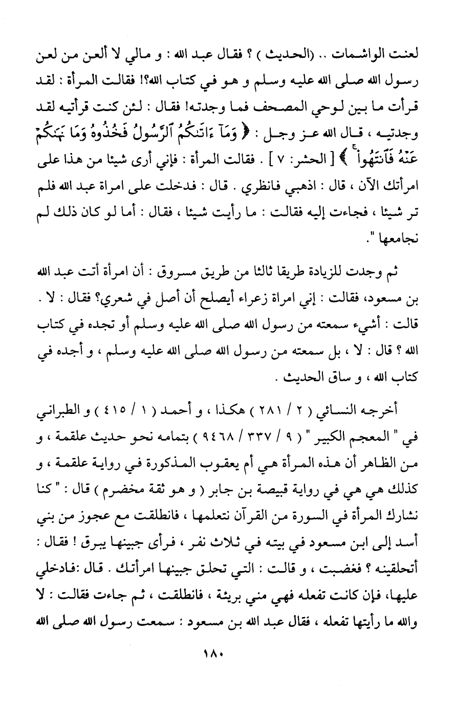 لعنت الواشمات .. (الحديث)؟ فقال عبد الله: ومالي لا ألعن من لعن رسول الله صلى الله عليه وسلم وهو في كتاب الله؟! فقالت المرأة: لقد قرأت ما بين لوحي المصحف فما وجدته! فقال: لئن كنت قرأتيه لقد وجدتيه، قال الله عز وجل: {وَمَا آتَاكُمُ الرَّسُولُ فَخُذُوهُ وَمَا نَهَاكُمْ عَنْهُ فَانْتَهُوا} [الحشر: 7]. فقالت المرأة: فإني أرى شيئا من هذا على امرأتك الآن، قال: اذهبي فانظري. قال: فدخلت على امراة عبد الله فلم تر شيئا، فجاءت إليه فقالت: ما رأيت شيئا، فقال: أما لو كان ذلك لم نجامعها ".