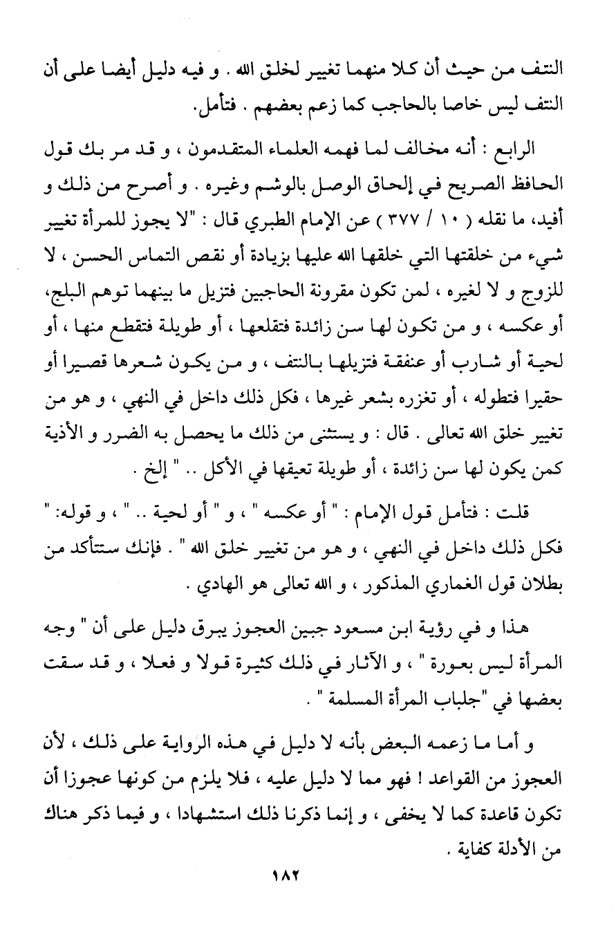 الرابع: أنه مخالف لما فهمه العلماء المتقدمون، وقد مر بك قول الحافظ الصريح في إلحاق الوصل بالوشم وغيره. وأصرح من ذلك وأفيد، ما نقله (10/ 377) عن الإمام الطبري قال: "لا يجوز للمرأة تغيير شيء من خلقتها التي خلقها الله عليها بزيادة أو نقص التماس الحسن، لا للزوج ولا لغيره، لمن تكون مقرونة الحاجبين فتزيل ما بينهما توهم البلج، أو عكسه، ومن تكون لها سن زائدة فتقلعها، أو طويلة فتقطع منها، أو لحية أو شارب أو عنفقة فتزيلها بالنتف، ومن يكون شعرها قصيرا أو حقيرا فتطوله، أو تغزره بشعر غيرها، فكل ذلك داخل في النهي، وهو من تغيير خلق الله تعالى. قال: ويستثنى من ذلك ما يحصل به الضرر والأذية كمن يكون لها سن زائدة، أو طويلة تعيقها في الأكل .. " إلخ.