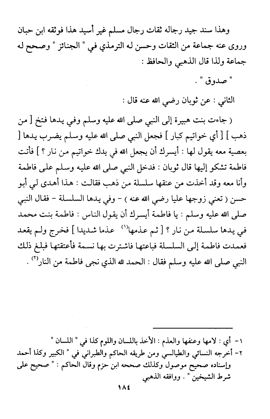 (جاءت بنت هبيرة إلى النبي صلى الله عليه وسلم وفي يدها فتخ [من ذهب] [أي خواتيم كبار] فجعل النبي صلى الله عليه وسلم يضرب يدها [بعصية معه يقول لها: أيسرك أن يجعل الله في يدك خواتيم من نار؟] فأتت فاطمة تشكو إليها قال ثوبان: فدخل النبي صلى الله عليه وسلم على فاطمة وأنا معه وقد أخذت من عنقها سلسلة من ذهب فقالت: هذا أهدى لي أبو حسن (تعني زوجها عليا رضي الله عنه) - وفي يدها السلسلة - فقال النبي صلى الله عليه وسلم: يا فاطمة أيسرك أن يقول الناس: فاطمة بنت محمد في يدها سلسلة من نار؟ [ثم عذمها (¬1) ... عذما شديدا] فخرج ولم يقعد فعمدت فاطمة إلى السلسلة فباعتها فاشترت بها نسمة فأعتقتها فبلغ ذلك النبي صلى الله عليه وسلم فقال: الحمد لله الذي نجى فاطمة من النار (¬2).