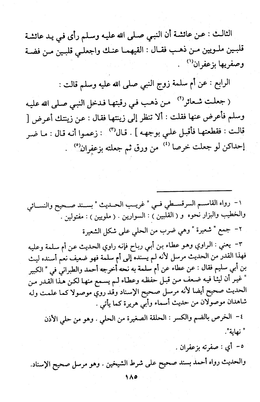 الثالث: عن عائشة أن النبي صلى الله عليه وسلم رأى في يد عائشة قلبين ملويين من ذهب فقال: القيهما عنك واجعلي قلبين من فضة وصفريها بزعفران (¬1) ...