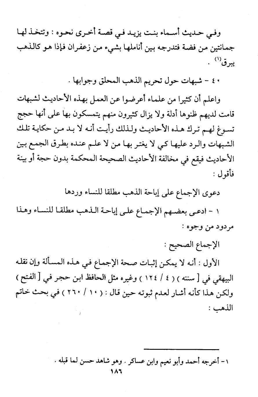 الأول: أنه لا يمكن إثبات صحة الإجماع في هذه المسألة وإن نقله البيهقي في [سننه) (4/ 124) وغيره مثل الحافظ ابن حجر في [الفتح) ولكن هذا كأنه أشار لعدم ثبوته حين قال: (10/ 260) في بحث خاتم الذهب: