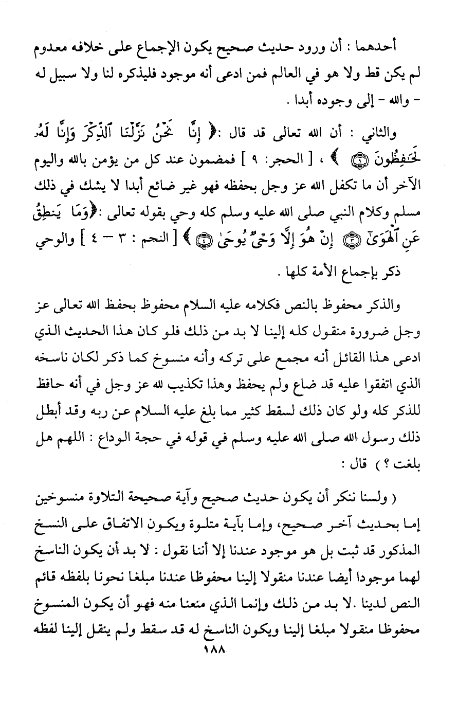 (ولسنا ننكر أن يكون حديث صحيح وآية صحيحة التلاوة منسوخين إما بحديث آخر صحيح, وإما بآية متلوة ويكون الاتفاق على النسخ المذكور قد ثبت بل هو موجود عندنا إلا أننا نقول: لا بد أن يكون الناسخ لهما موجودا أيضا عندنا منقولا إلينا محفوظا عندنا مبلغا نحونا بلفظه قائم النص لدينا. لا بد من ذلك وإنما الذي منعنا منه فهو أن يكون المنسوخ محفوظا منقولا مبلغا إلينا ويكون الناسخ له قد سقط ولم ينقل إلينا لفظه